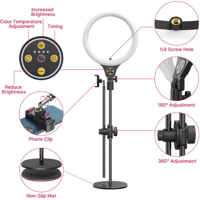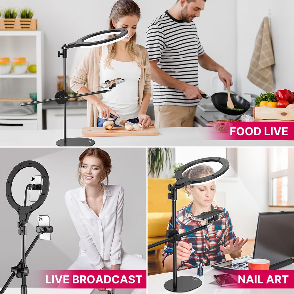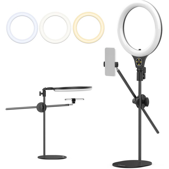 Komplet Ulanzi T1 Overhead Ring Light Set je 10-palčna LED-obročna svetilka z nastavljivo višino do 32 palcev za osvetlitev od zgoraj. Z barvno temperaturo 3500–6500 K, 11 stopnjami svetlosti in vgrajenim držalom za telefon je idealna za vloge o hrani, lepoti in modi ali za ustvarjanje vsebin na namizju.
