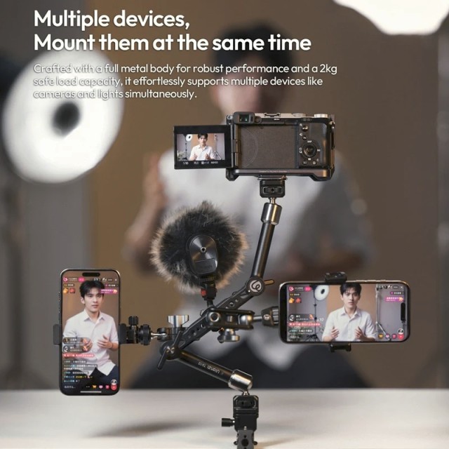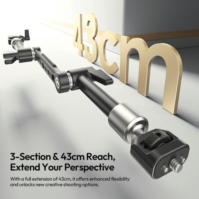 Ulanzi TA10 3-delni Magic Articulating Arm ponuja večji doseg, trdno podporo in vsestransko namestitev za kamere, luči in dodatke. S polnim podaljšanjem 43 cm, 360° vrtenjem kroglaste glave in robustno kovinsko konstrukcijo je zasnovan za profesionalne, prilagodljive nastavitve snemanja.