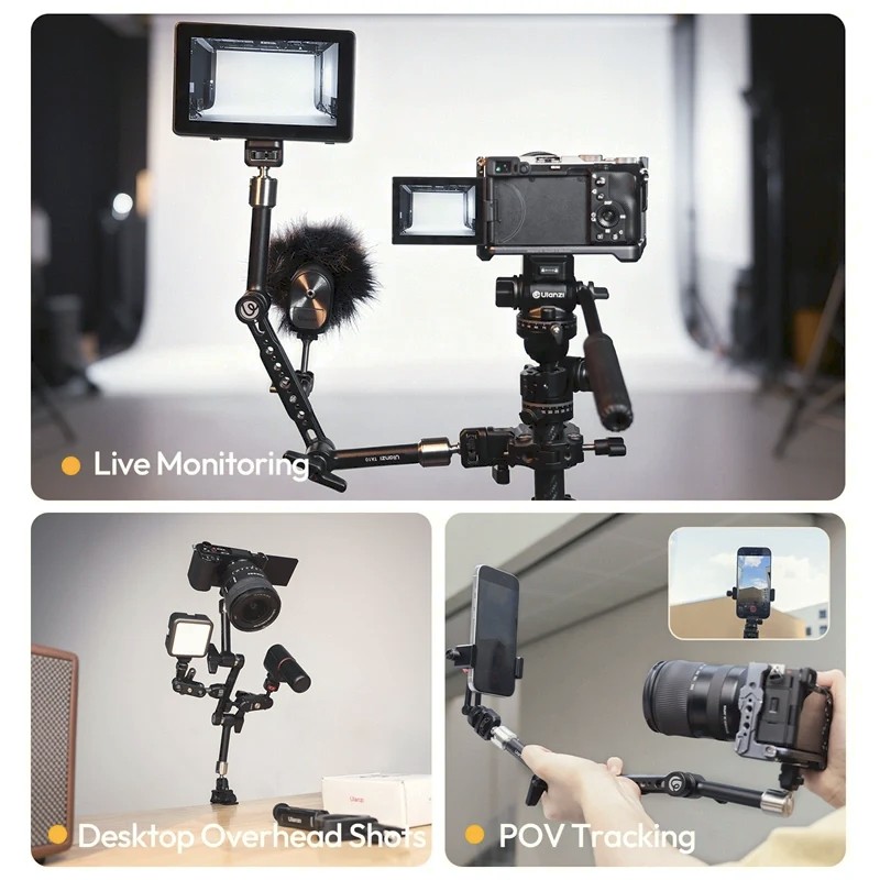 Ulanzi TA10 3-delni Magic Articulating Arm je namenjen ustvarjalcem, ki potrebujejo maksimalno fleksibilnost in zanesljivo trdnost v enem kompaktnem rešitvi. S svojo tridelno artikulirano zasnovo in polno dolžino 43 cm ta roka omogoča bolj kreativne snemalne kote za spremljanje v živo, posnetke nad mizo, sledenje POV in kompleksne konstrukcije.