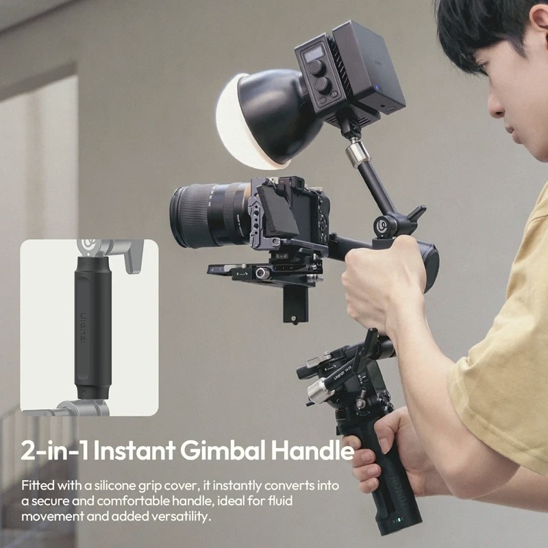 Izjemna lastnost je njegova zasnova ročaja v slogu 2-v-1 gimbala. S priloženim silikonskim pokrovom za ročaj se ročaj lahko takoj spremeni v udoben ročni ročaj za gladko gibanje in dinamične posnetke. Za razširjene možnosti opreme je obojestranska zasnova z več režami opremljena z navoji ¼"-20, navojem ⅜"-16, ARRI lokacijskimi zatiči in NATO tirnico, kar zagotavlja varno pritrditev brez vrtenja.