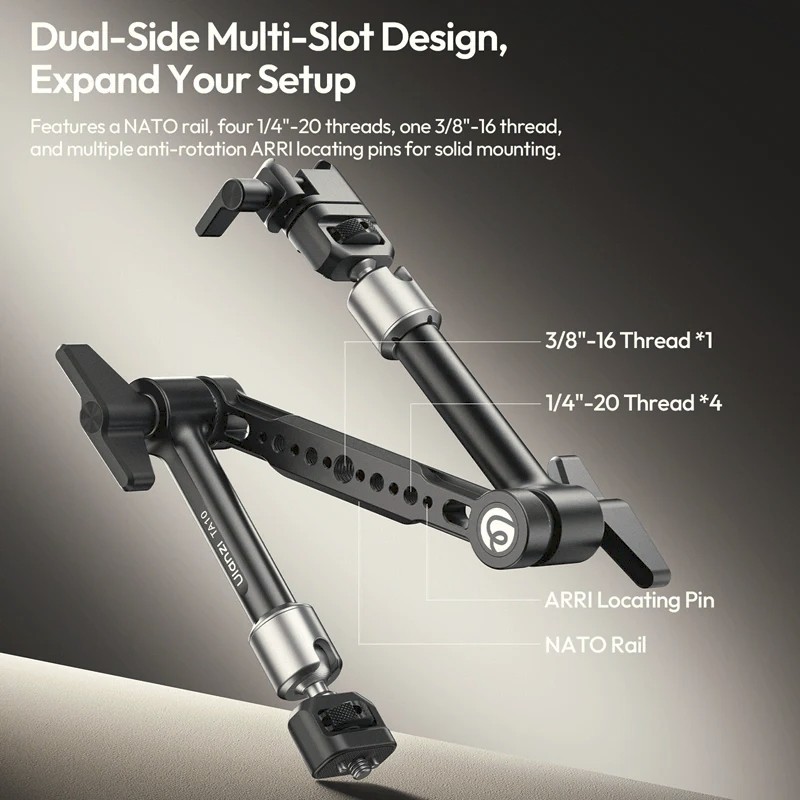 TA10 je izdelan iz aluminijeve zlitine, nerjavečega jekla in silikona ter zagotavlja varno nosilnost 2 kg v vodoravni in do 4,5 kg v navpični smeri, kar omogoča hkratno podporo kamer, LED-luči, monitorjev ali več dodatkov. Vgrajena 360° vrtljiva kroglasta glava z 90° preklopom usmeritve omogoča enostavno natančno nastavitev kotov.