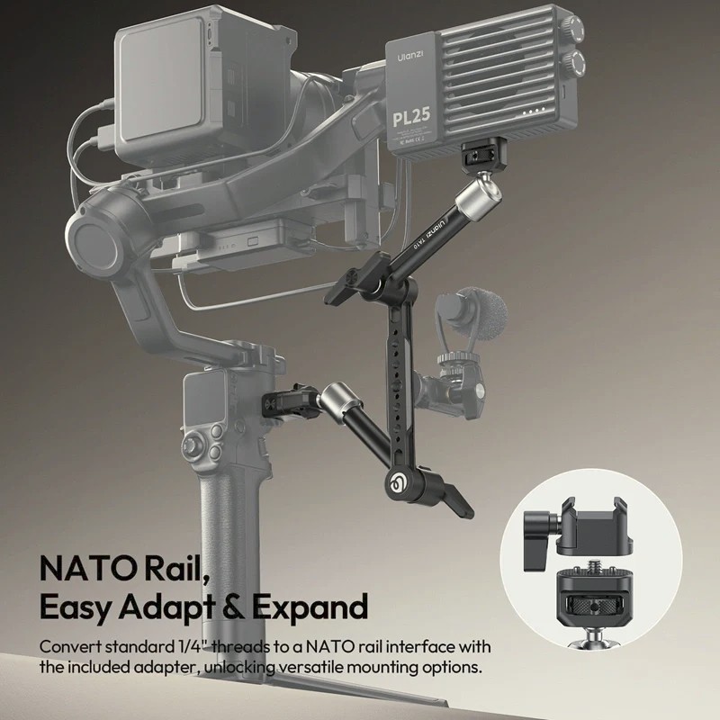 Priloženi adapter NATO na ¼"-20 dodatno izboljša združljivost, zaradi česar je TA10 odlična izbira za profesionalne kamere, studijske postavitve in mobilna snemalna okolja.