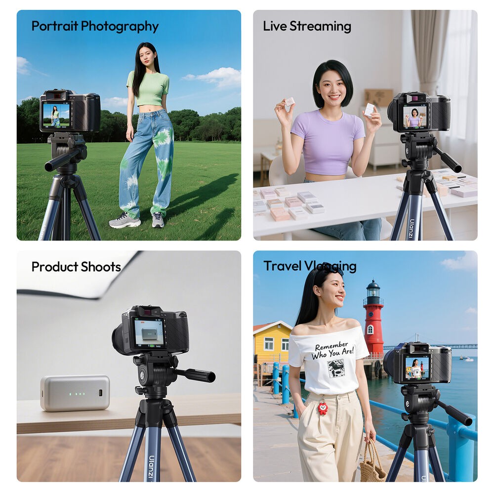 Ulanzi TT39 Video Tripod je lahek, vsestranski aluminijasti stativ, zasnovan za ustvarjalce, ki so veliko na poti. Z največjo višino 61", glavo za hitro sprostitev tipa Arca in nosilnostjo 6,6 lb je idealen za kamere, majhne naprave in pametne telefone. Petdelne noge, glava za nagibanje/vrtanje in priložena oprema ga naredijo idealnega za snemanje iz nizkega in visokega kota, kompaktna zložljiva zasnova in torba za prenašanje pa zagotavljata enostaven prevoz.