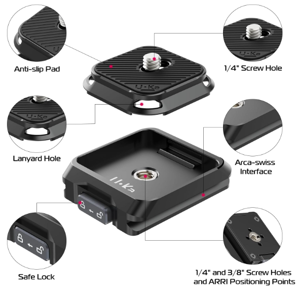Ulanzi UKA03 Quick Release Base je kompakten, letalski aluminijasti motor za nemoteno menjavanje opreme, ki tehta le 52 g, hkrati pa podpira do 20 kg obremenitev za DSLR-je, brezzrcalne kamere, kot sta Sony A1 ali Canon 1D X, Osmo Pocket 3, držala za telefone in naprave standarda Arca prek svojih vsestranskih vijakov 1/4"-3/8" in lokacijskih lukenj…