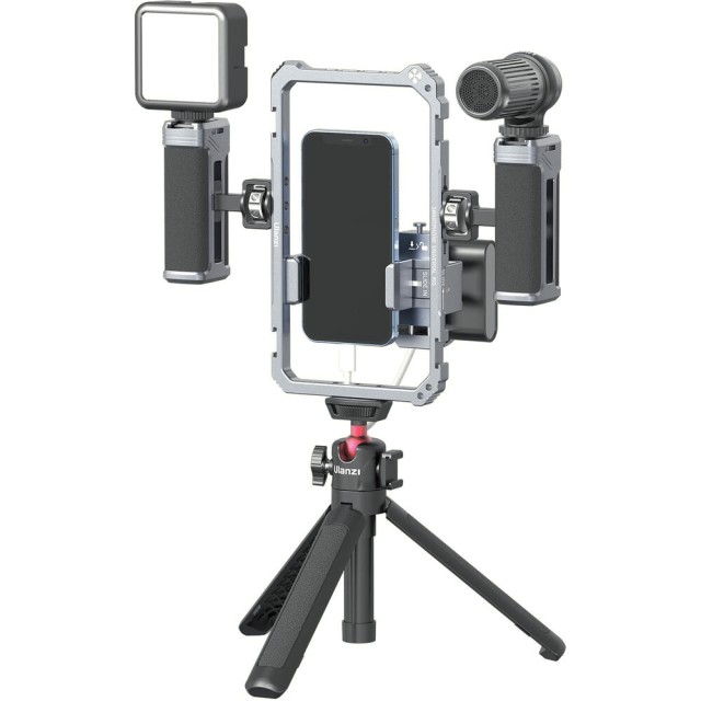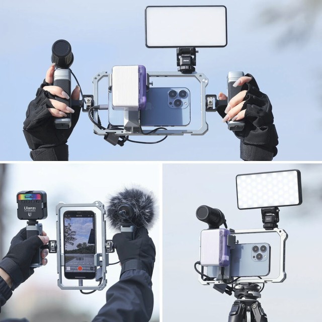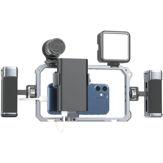 Ulanzi Universal Phone Vlogging Video Rig je vsestranski, profesionalni nosilec za pametne telefone, ki ponuja dvojna nastavljiva ročaja, več pritrdilnih točk in protizdrsno oblazinjenje za stabilizacijo posnetkov za vloge, pretakanje ali mobilno snemanje filmov.