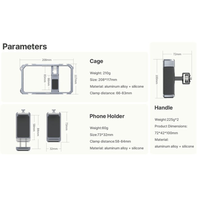 Tristranska protizdrsna silikonska oblazinjenost ščiti vaš telefon in ga varuje, medtem ko robustna konstrukcija iz aluminijeve zlitine zagotavlja trajnost brez dodatne teže. Ne glede na to, ali snemate vloge, prenašate v živo ali ustvarjate kinematografske mobilne vsebine, ta oprema zagotavlja stabilnost in razširljivost, ki izboljšata vaš delovni tok.