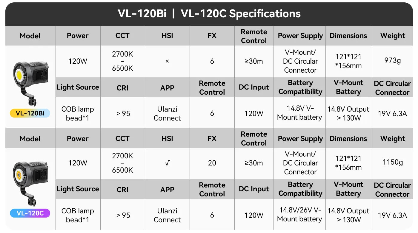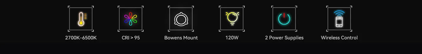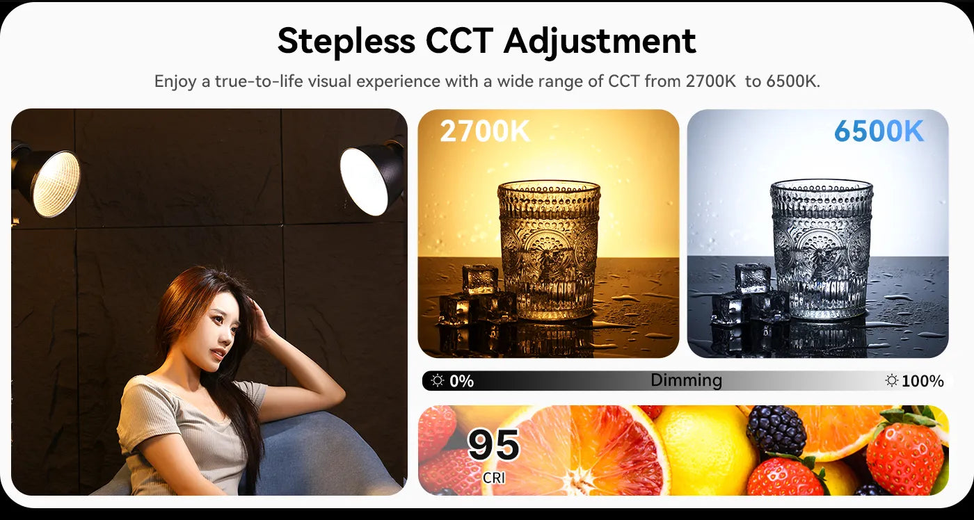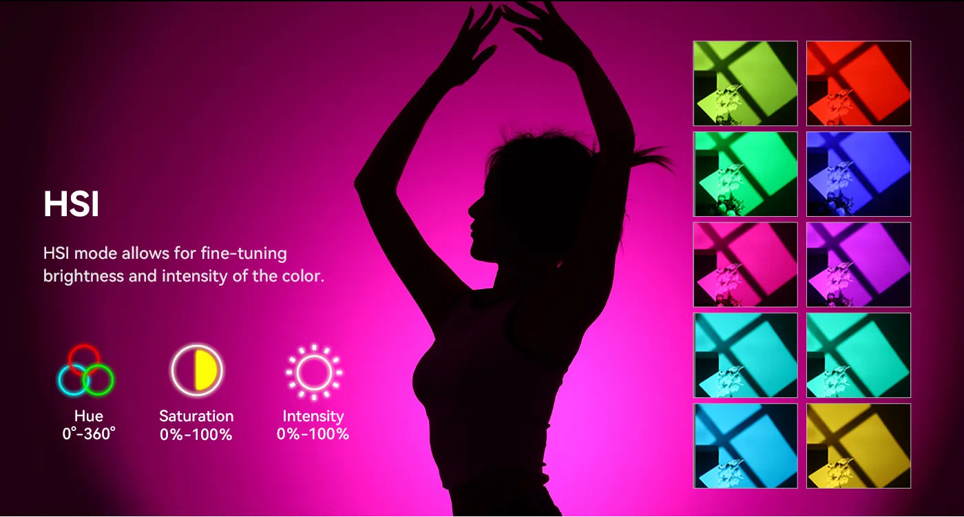 Z dvojno možnostjo napajanja lahko na prostem uporabite baterijo V-mount za mobilnost ali DC napajalnik v zaprtih prostorih za stabilno napajanje. Barvno temperaturo lahko brezstopenjsko nastavljate od 2700K do 6500K (CRI>95) in jo zatemnitve od 0 % do 100 %. V načinu HSI lahko natančno nastavite barvni odtenek, nasičenost in intenzivnost v celotnem 360° barvnem spektru.