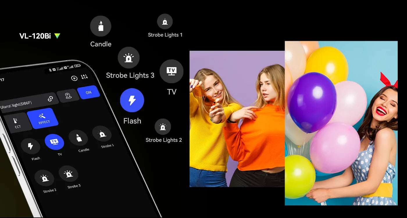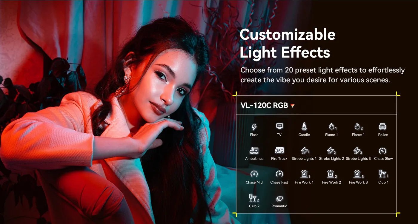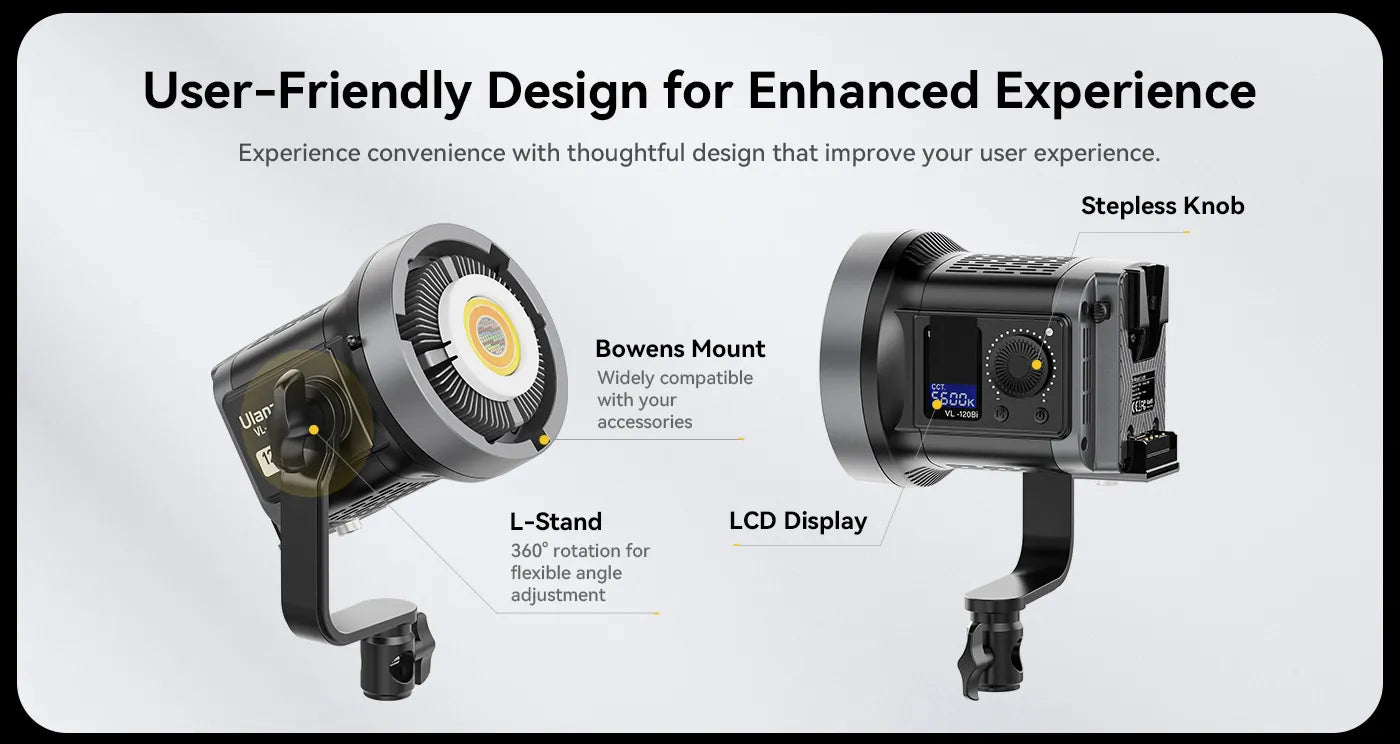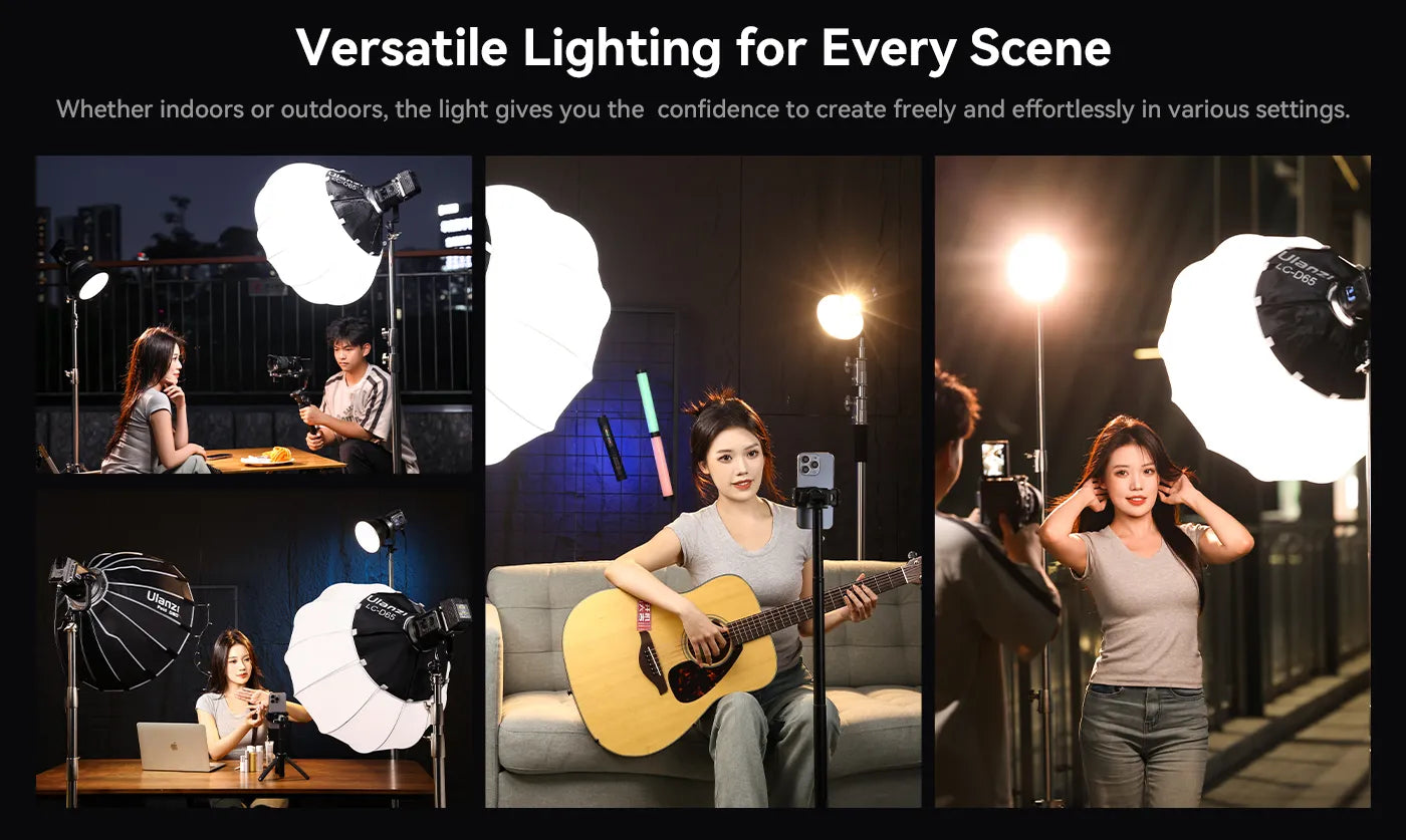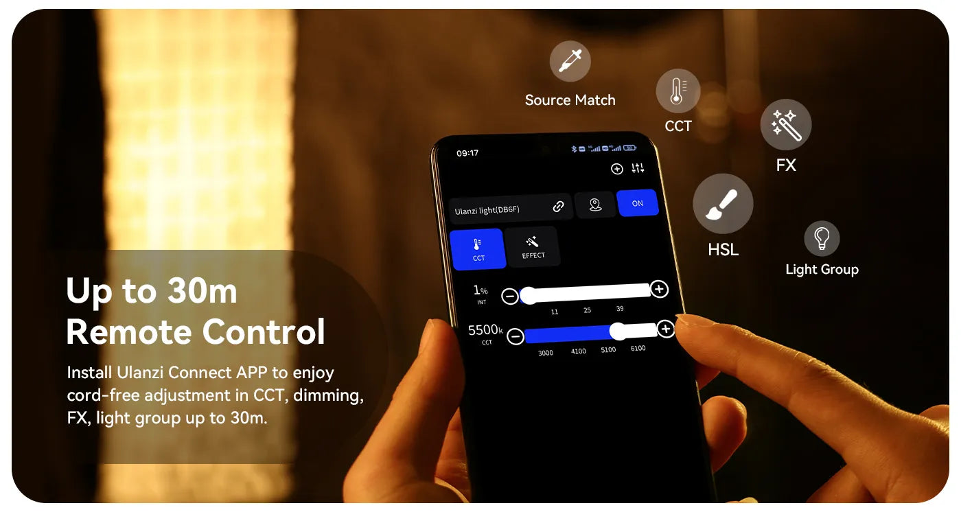 S pomočjo aplikacije Ulanzi Connect lahko svetlobo nadzorujete do 30 m daleč in prilagajate nastavitve, kot so CCT, zatemnitve, FX in svetlobne skupine. Uživajte v 20 vnaprej nastavljenih svetlobnih učinkih z RGB različico ali 6 z dvobarvno različico. Uporabniku prijazne funkcije vključujejo LCD zaslon, brezstopenjski gumb, 360° vrtljiv L-stojalo in združljivost z Bowensovim nosilcem.
