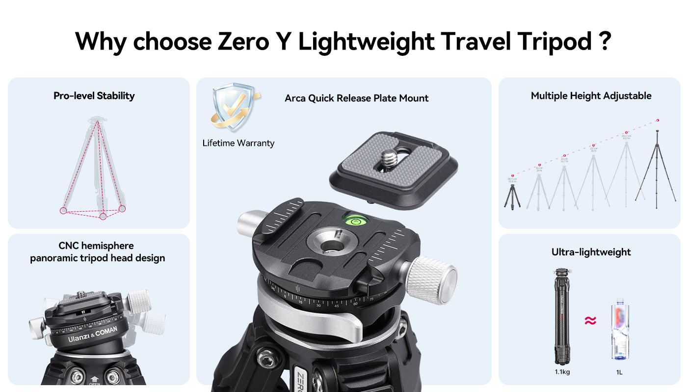 Ulanzi Zero-Y lahki potovalni stativ iz ogljikovih vlaken 3028. Stabilnost na profesionalni ravni. Edinstvena zasnova omogoča hitrejšo in enostavnejšo postavitev/razstavljanje. Izjemno lahek. Nastavljiva višina. CNC polkrožna panoramska glava stativa.