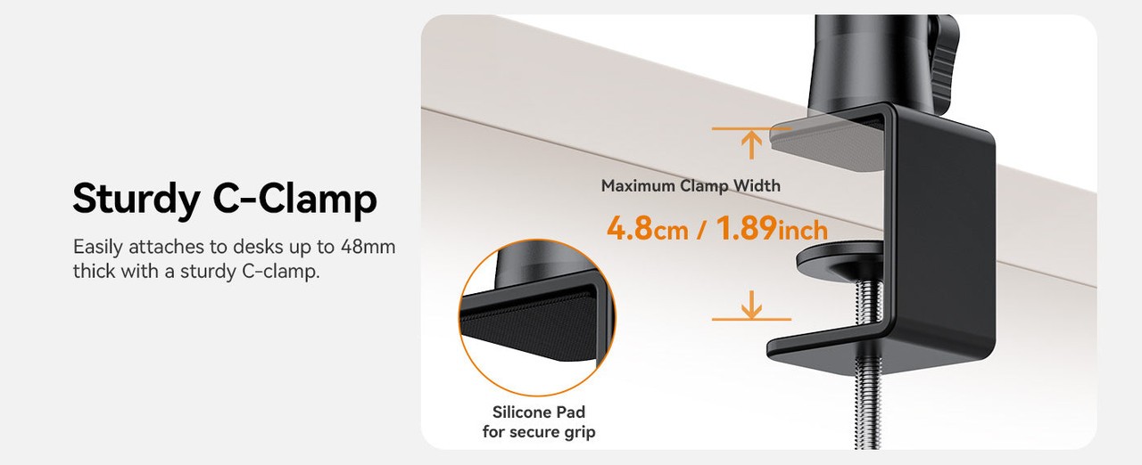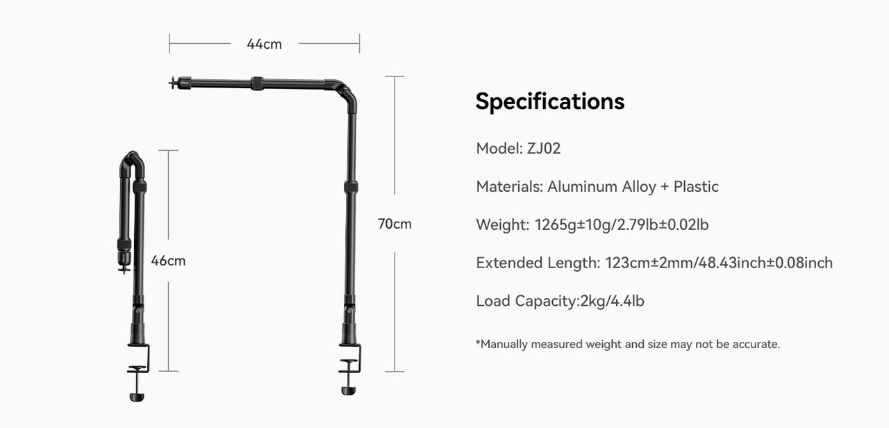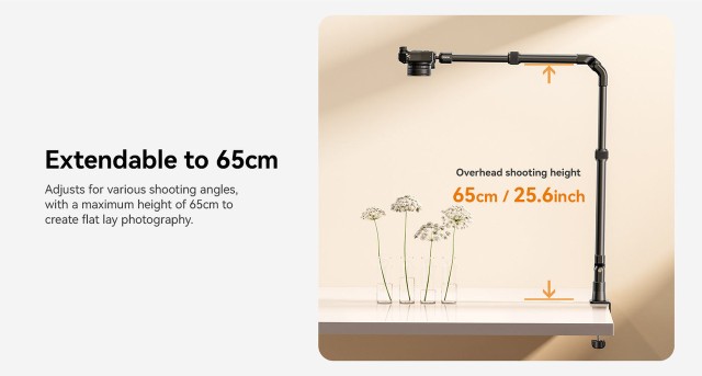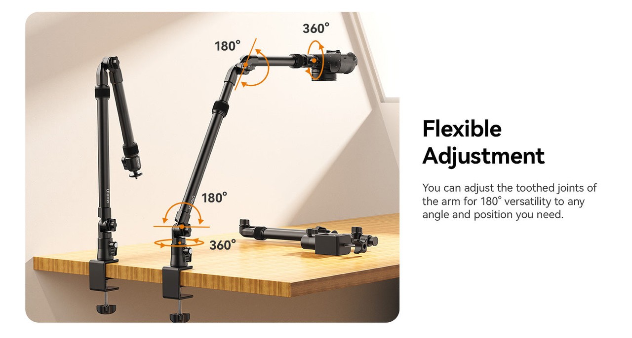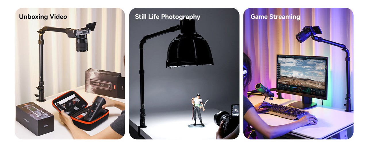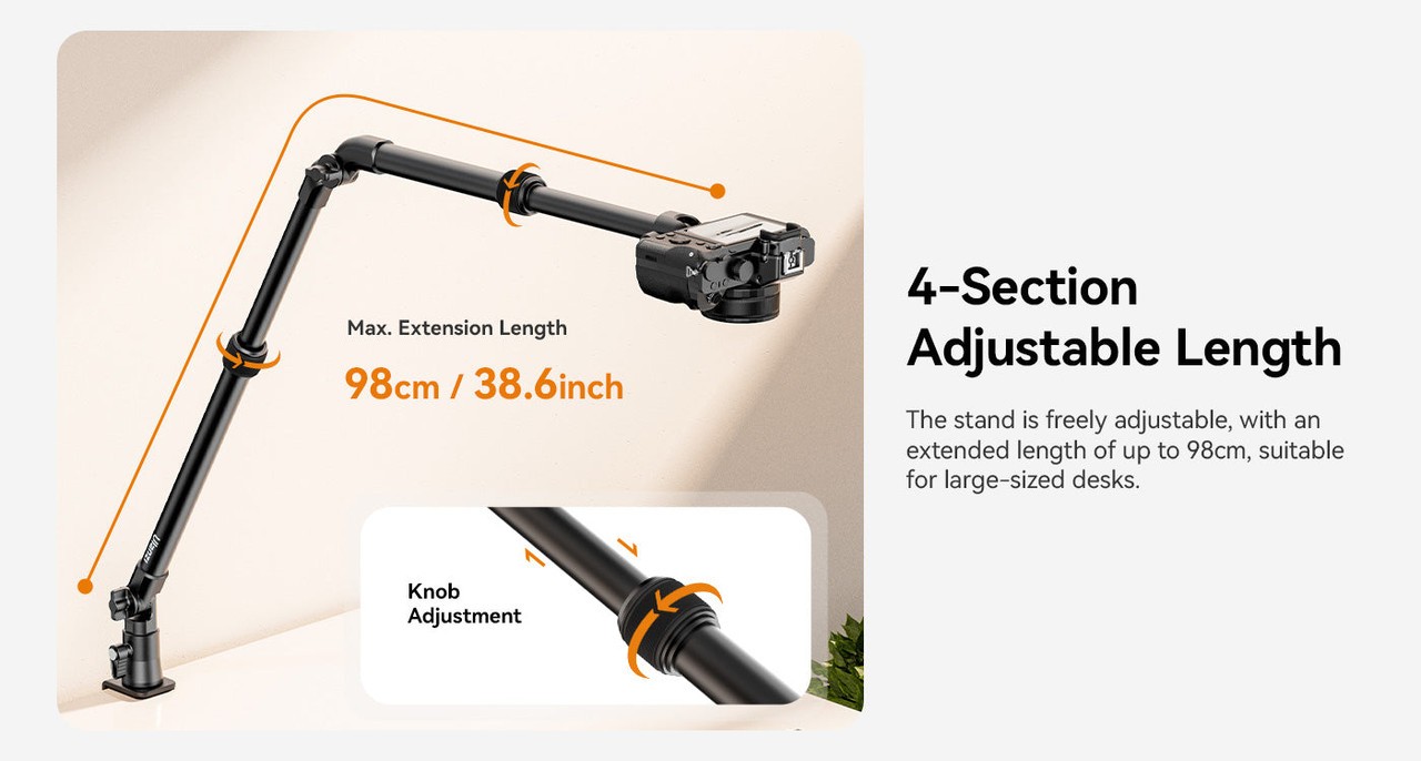 Ulanzi ZJ02 C-Clip Folding Bracket je vsestranski aluminijasti nosilec za mizo s prilagodljivim držalom, ki je idealen za fotografiranje v ravni legi, pretakanje ali posnetke z višine. Nastavljiv do višine 65 cm in dolžine 123 cm, z robustno C-sponko varno podpira naprave do 2 kg.