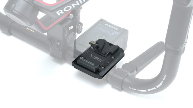 Ta baterijska plošča V-Mount se pritrdi neposredno na osnovno ali napredno obročasto držalo za RS 2 in omogoča napajanje gimbala z baterijami V-Mount večje zmogljivosti brez zunanjih kablov.