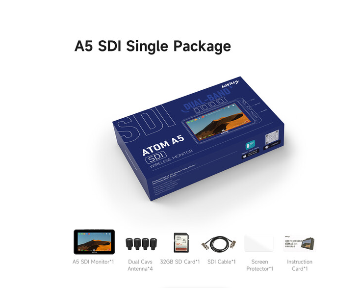 Vaxis Atom A5 SDI je kompakten 5,5-palčni brezžični monitor z zaslonom na dotik ločljivosti 1920 x 1080 in vgrajeno funkcijo TX/RX, ki podpira domet prenosa do 1000' znotraj ekosistema Atom, ima SDI/HDMI vhod in izhod, vgrajeno snemanje MP4 na microSD, dvojno ploščo za baterije serije L, svetlost 2000 cd/m², zamenljive antene, sinhronizacijo časovnega kodeka, podporo 3D LUT in napredna orodja CINE OS, vključno z obsegom in vrhunskimi funkcijami za natančno spremljanje na snemalnem prizorišču in brezžično sledenje fokusu.