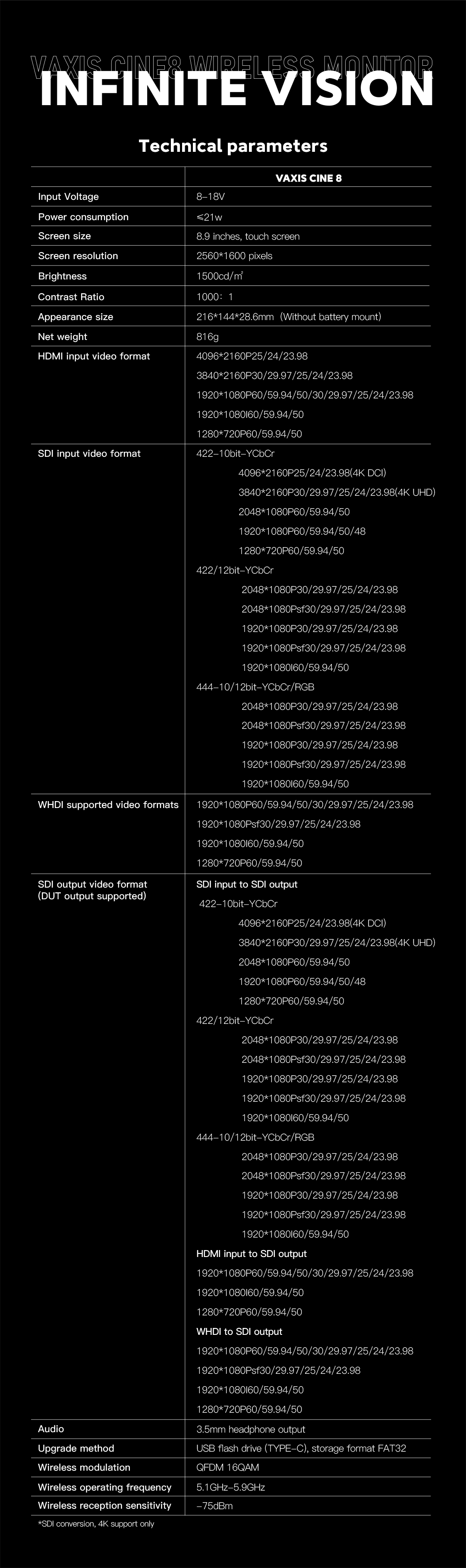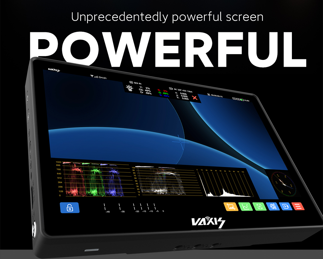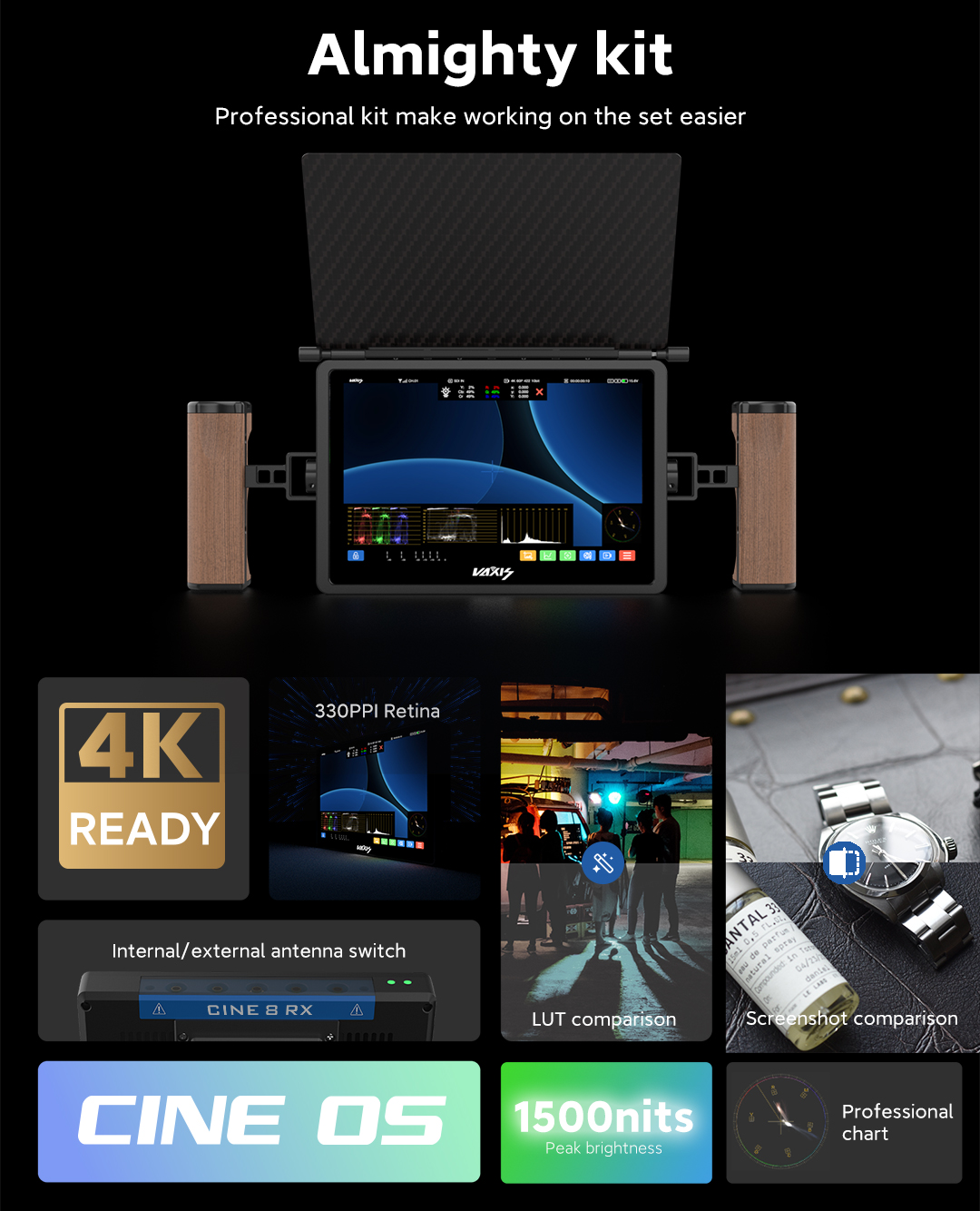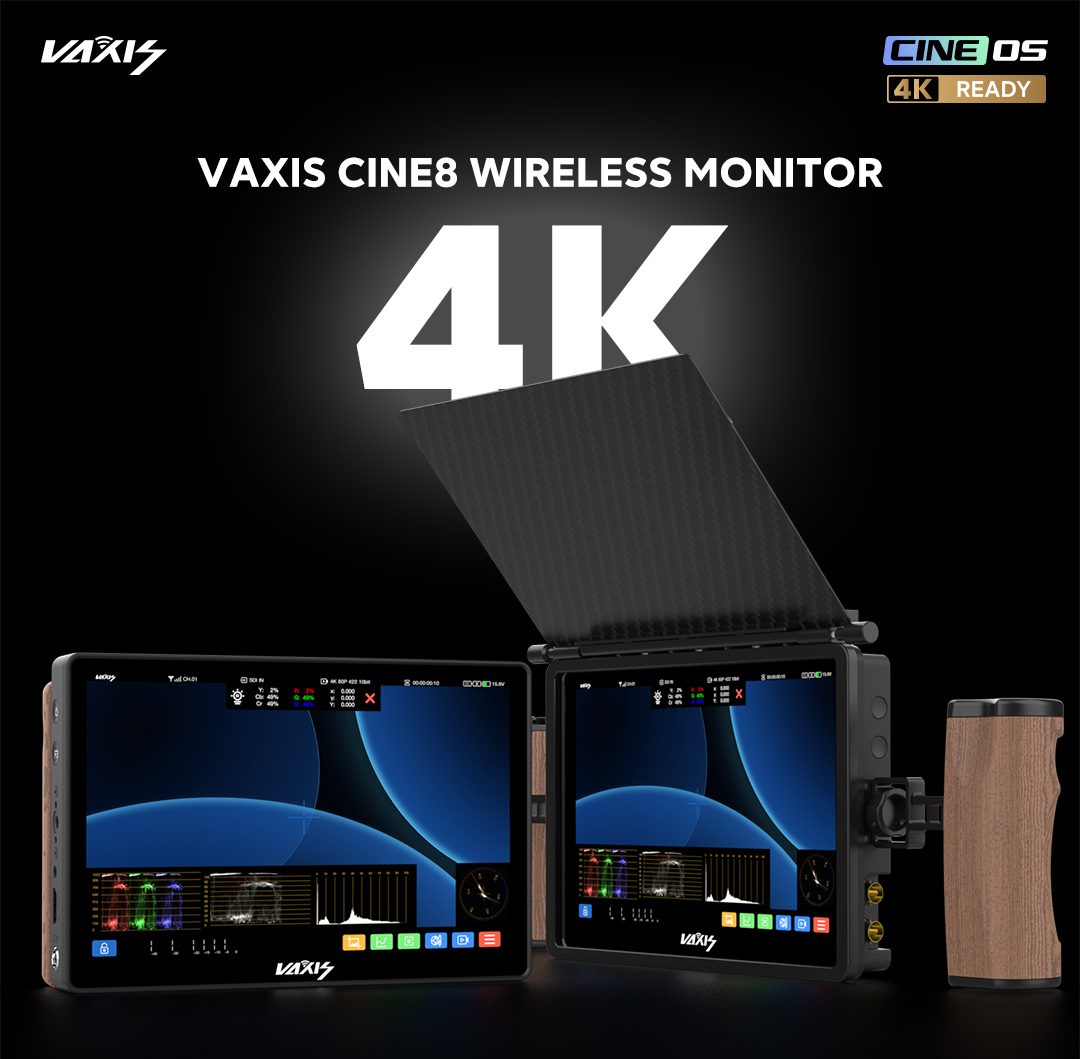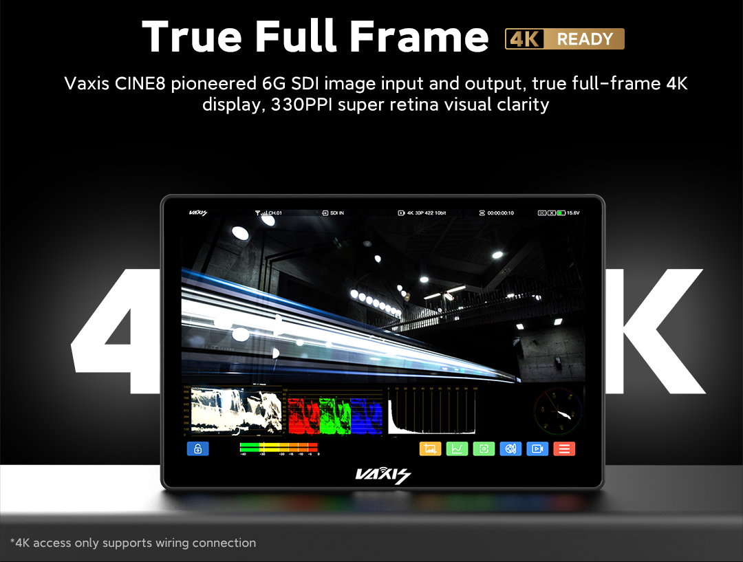 Imajo vse funkcije običajnega brezžičnega video sistema in optimiziran način interakcije. Zagotavlja različne načine izbire antene in vključuje funkcijo frekvenčnega razpona. Podrobno orodje za spremljanje. Diagrami valovnih oblik, vektorski diagrami, histogrami, ovojnice in vsebujejo vse. Pripravljen na snemanje v polnem kadru 4K READY. Vaxis CINE8 je pionir na področju video vhoda in izhoda 6G SDI, pravi polni zaslon 4K, vizualna jasnost super mrežnice 303PPI. 1+1 > 2. Hkratni prikaz slik iz več kotov kamere AB