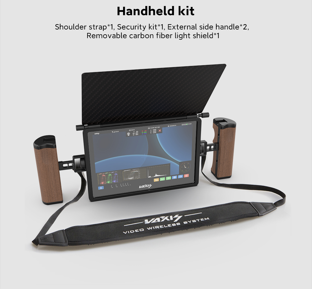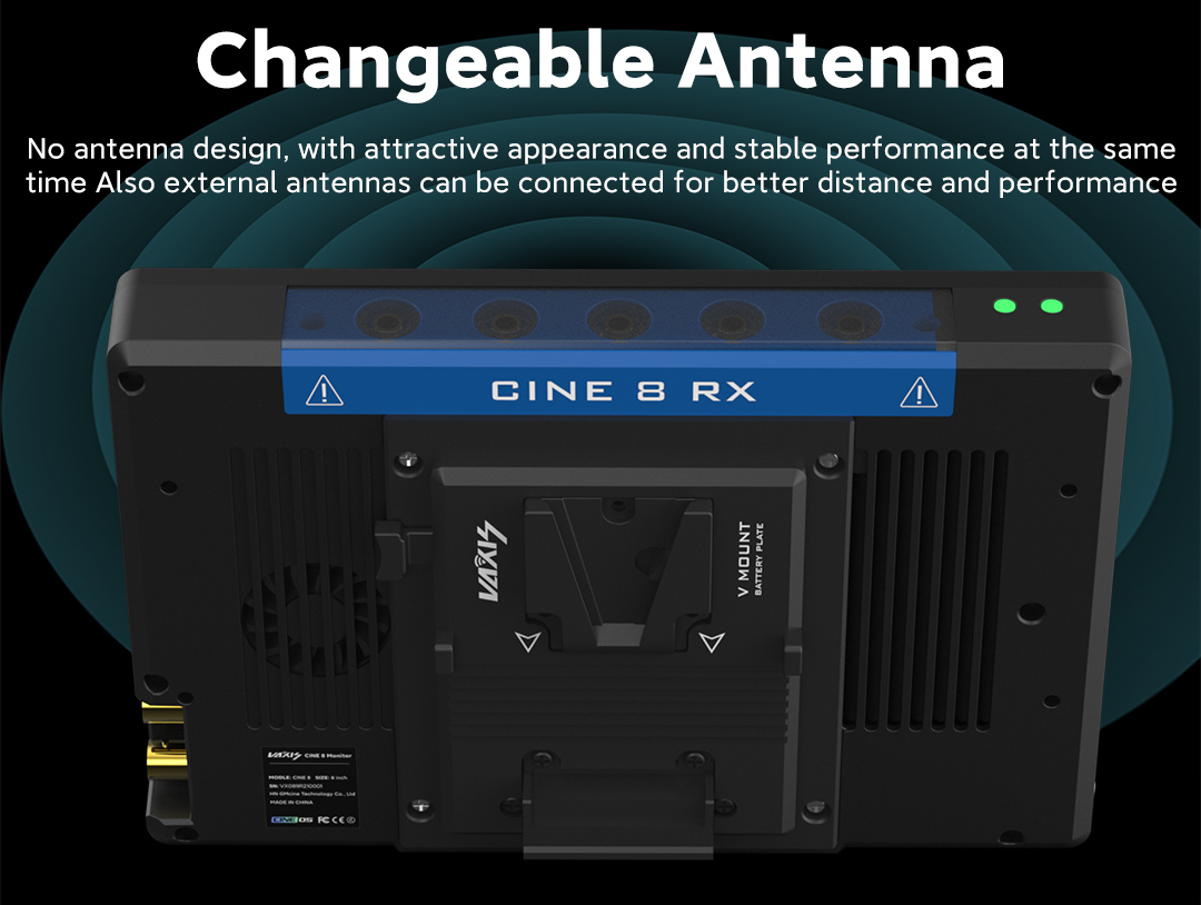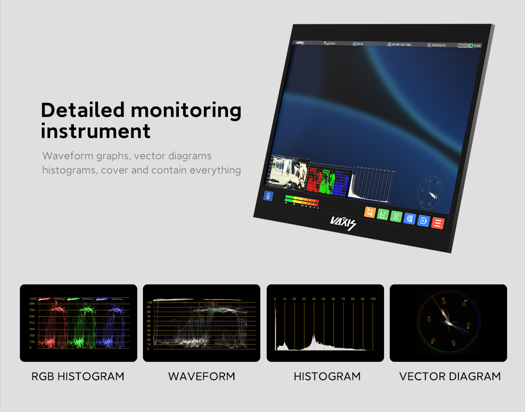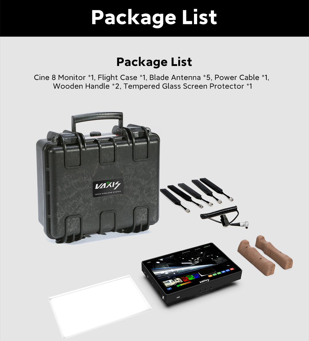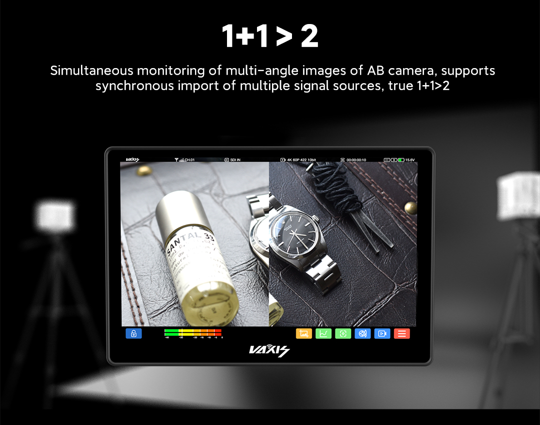 Imajo vse funkcije običajnega brezžičnega video sistema in optimiziran način interakcije. Zagotavlja različne načine izbire antene in vključuje funkcijo frekvenčnega razpona. Podrobno orodje za spremljanje. Diagrami valovnih oblik, vektorski diagrami, histogrami, ovojnice in vsebujejo vse. Pripravljen na snemanje v polnem kadru 4K READY. Vaxis CINE8 je pionir na področju video vhoda in izhoda 6G SDI, pravi polni zaslon 4K, vizualna jasnost super mrežnice 303PPI. 1+1 > 2. Hkratni prikaz slik iz več kotov kamere AB