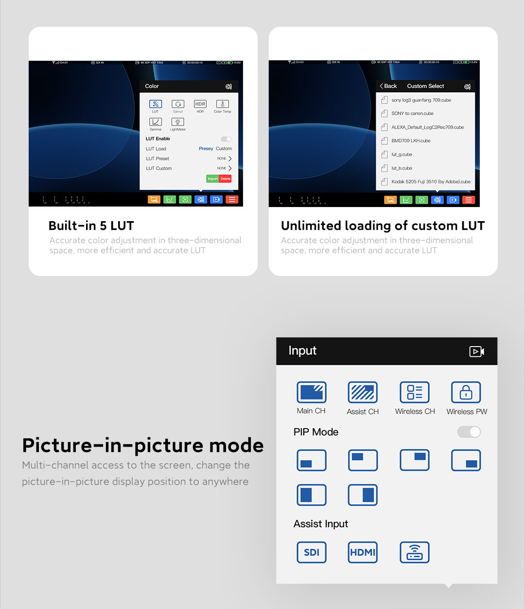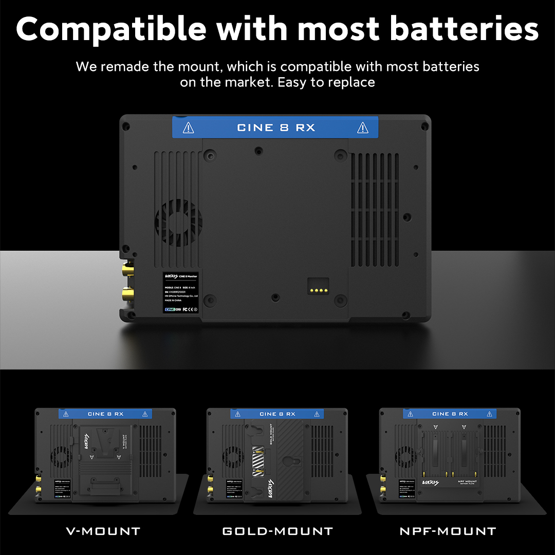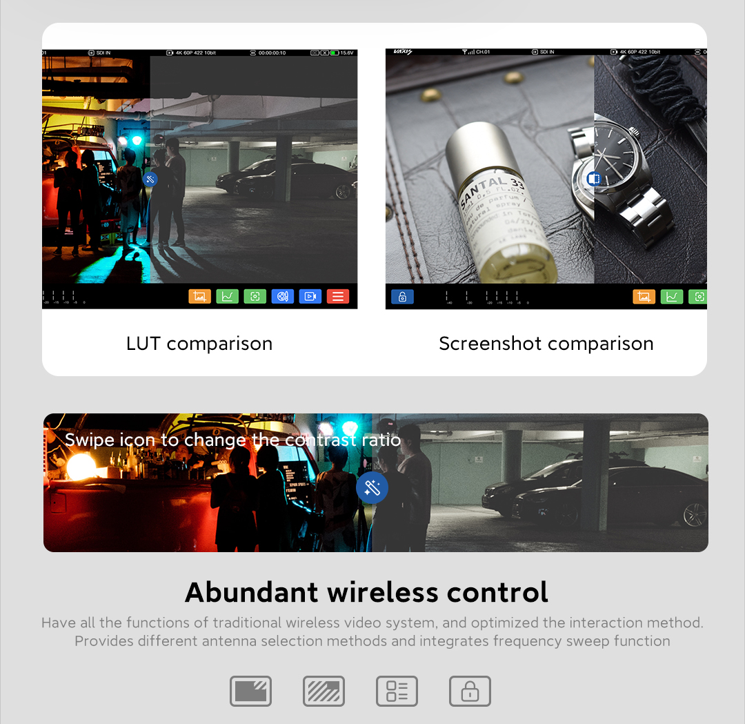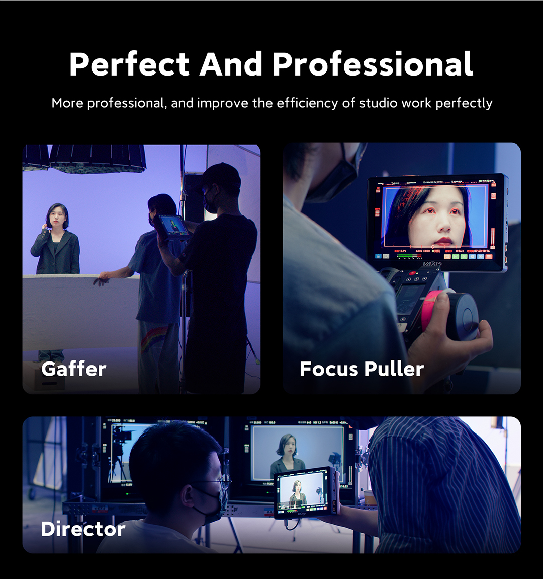 Imajo vse funkcije običajnega brezžičnega video sistema in optimiziran način interakcije. Zagotavlja različne načine izbire antene in vključuje funkcijo frekvenčnega razpona. Podrobno orodje za spremljanje. Diagrami valovnih oblik, vektorski diagrami, histogrami, ovojnice in vsebujejo vse. Pripravljen na snemanje v polnem kadru 4K READY. Vaxis CINE8 je pionir na področju video vhoda in izhoda 6G SDI, pravi polni zaslon 4K, vizualna jasnost super mrežnice 303PPI. 1+1 > 2. Hkratni prikaz slik iz več kotov kamere AB