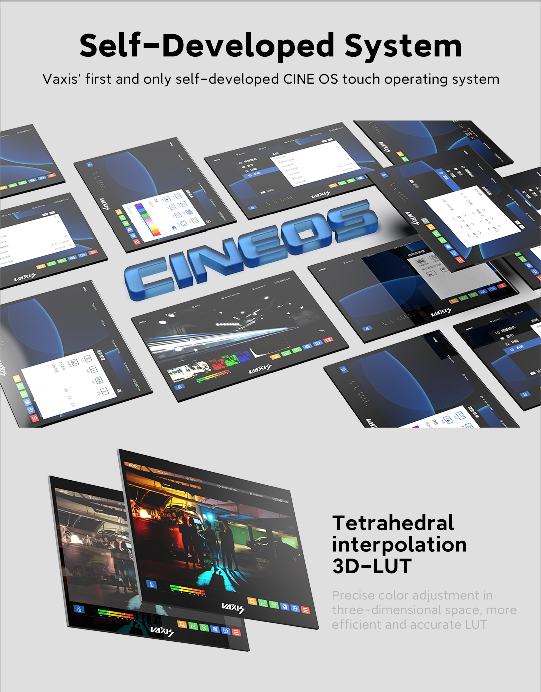 Monitor Vaxis Storm Cine 8 - 8,9-palčni, ločljivost 4K 2560 × 1600 pik, največja svetilnost 1500 nitov - z vgrajenim sistemom Storm 3000 RX. Lastniški sistem Prvi in edini lastniški operacijski sistem Vaxis CINE OS za zaslone na dotik. Tetraedrična interpolacija 3D-LUT .natančno prilagajanje barv v tridimenzionalnem prostoru, učinkovitejša in natančnejša LUT. način slike v sliki. Večkanalni dostop do zaslona, spreminjanje položaja prikaza slike v sliki na poljubno mesto. Primerjava zaslonov in LUTS. Netradicionalno zamrzovanje slike, trenutno zaslonsko sliko in sliko v realnem času lahko primerjate neposredno v sistemu. Bogato brezžično upravljanje
