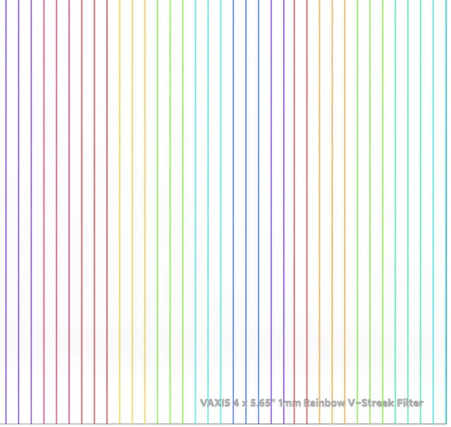 Filter VFX 4 x 5,65" Rainbow Streak Filter podjetja Vaxis se namesti v združljive matte boxe in ustvari podolgovate mavrične črte, ki so simetrične in se vodoravno širijo iz točkovnih svetlobnih virov v prizoru. Z njim lahko pritegnete pozornost na določen del kadra ali ustvarite vizualno dramatičen učinek. Filter je izdelan iz vodno belega stekla, ki zagotavlja optično čistost in barvno zvestobo. Za shranjevanje in prevoz je priložena oblazinjena torbica.