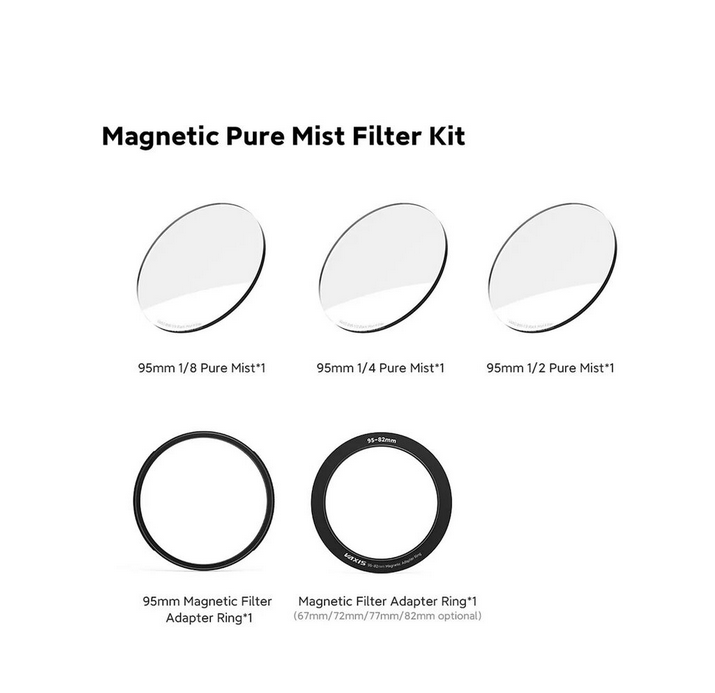 Komplet magnetnih filtrov Vaxis 95 mm VFX Magnetic Pure Mist Filter Kit vključuje tri filtre Pure Mist z močjo 1/2, 1/4 in 1/8, ki so zasnovani za matirno škatlo Tilta Mirage Matte Box, skupaj z 95-milimetrskim magnetnim adapterjem, ki omogoča hitro menjavanje in nalaganje filtrov na 95-milimetrske objektive brez odvijanja, kar zagotavlja mehko kakovost svetlobe z zmanjšanimi svetlimi deli in nižjim kontrastom za prilagodljive kinematografske učinke.