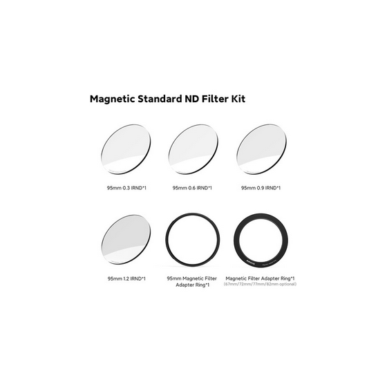 Komplet magnetnih standardnih ND filtrov Vaxis VFX 95 mm vključuje IRND filtre z 1-, 2-, 3- in 4-stopnjo z magnetnim adapterjem, ki omogočajo hitro menjavanje in nalaganje za natančen nadzor osvetlitve in resnično reprodukcijo barv. Združljivi so z 95-mm objektivi ali Tilta Mirage Matte Box, saj uporabljajo vrhunsko optično steklo K95 s polnim spektrom IR/UV odseka in dvostranskim 12-slojnim premazom.