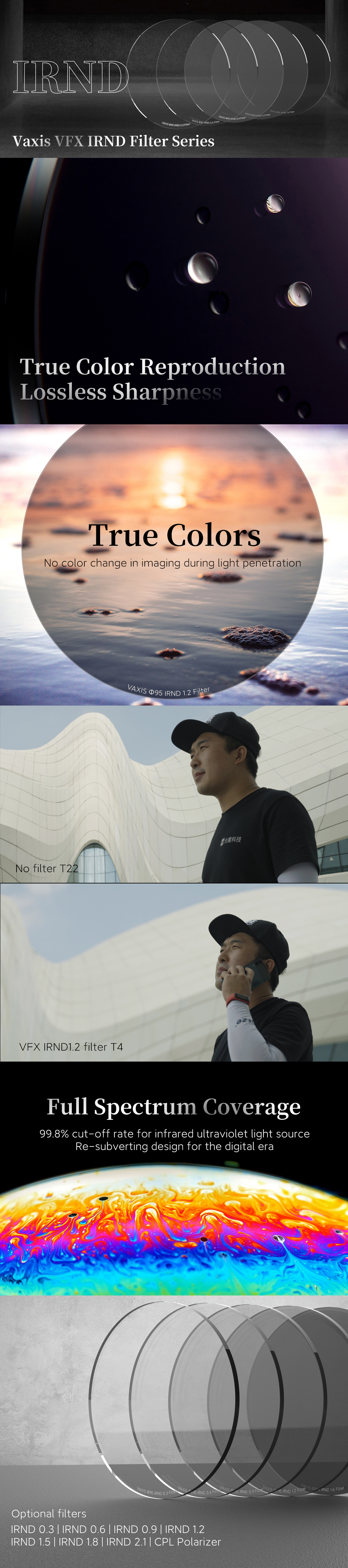 Vaxis VFX IRND filter 95 mm 1,8. Resnična reprodukcija barv, ostrina brez izgub. Resnične barve. Brez barvnih sprememb pri slikanju med prodiranjem svetlobe. Pokritost celotnega spektra. 99,8-odstotna stopnja izklopa za vir infrardeče ultravijolične svetlobe. Ponovna zasnova za digitalno dobo.