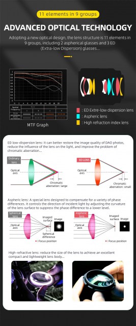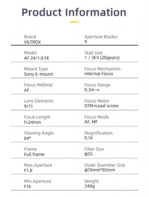 Širokokotni objektiv za brezzrcalne fotoaparate Sony E-mount (A7 do A9II; optimiziran za fotoaparate s senzorji FF) ima vrhunsko konstrukcijo (11 elementov v 9 skupinah, 9 zaslonk), vključno s 3 ED, 3 HR in 2 asferičnima lečama, ter HD Nano premaze za zatiranje kromatske aberacije, odličen kontrast in barvno reprodukcijo ter zmanjšanje bleščanja. Ta kompaktni objektiv (70x85 mm, 340 g) ima tudi zelo tiho samodejno ostrenje s koračnim motorjem STM za natančno samodejno ostrenje z minimalnimi tresljaji (vključno s podporo Eye AF); preklop v način MF je standarden. Vgrajena vrata micro USB omogočajo posodobitve vdelane programske opreme v prihodnosti. Priložena je sončna zaslonka. Zorni kot je 84°, najmanjša razdalja ostrenja 0,3 m, največja povečava 0,1, velikost filtra 55 mm. Različica za Sony E ( na voljo tudi za bajonet Nikon Z).