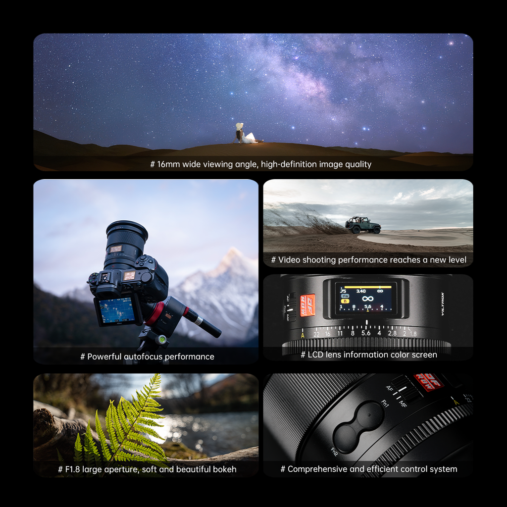 AF 16 mm F1,8 Z ima edinstvene prednosti za pokrajinsko/astrofotografijo, visoko ločljivost polnega okvirja in visokokakovostne slike. 3 asferične leče za natančno reprodukcijo točkovnih virov svetlobe in učinkovito zatiranje kome.