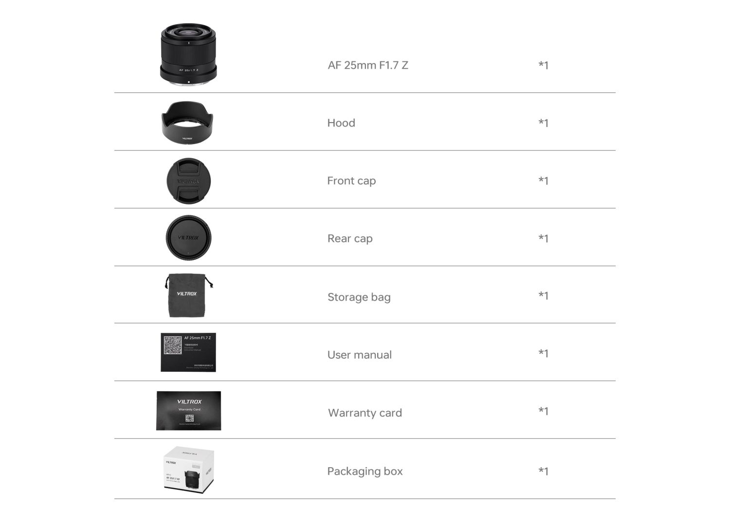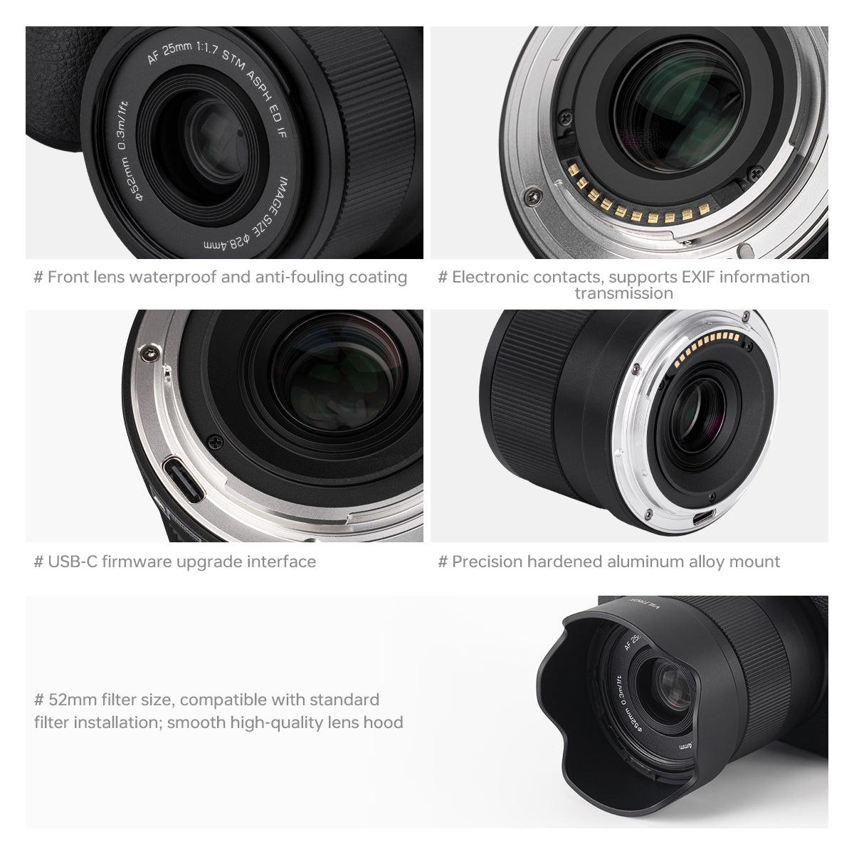 AF 25 mm F1,7 je Viltroxov lahki objektiv naslednje generacije z avtomatskim ostrenjem, ki ponuja izjemno vrednost za začetnike. Njegova kompaktna zasnova, natančno samodejno ostrenje in zaslonka F1,7 zagotavljajo odlično kakovost slike, zaradi česar ustvarjalno izražanje vsem uporabnikom ne povzroča težav. Prenosen in žepu prijazen objektiv omogoča, da je navdih vedno na dosegu roke.
