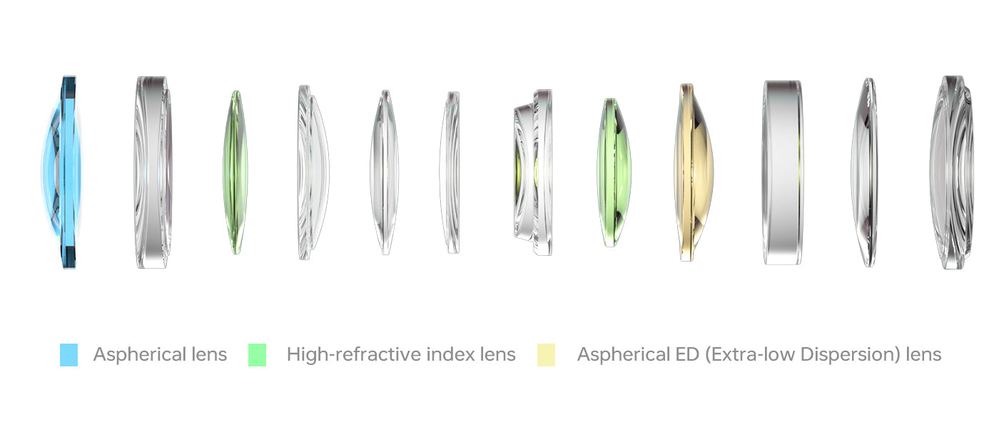 Ima 1 element z izjemno nizko disperzijo, 2 elementa z visokim lomnim količnikom in 2 asferična elementa z večplastnim nanosom HD,