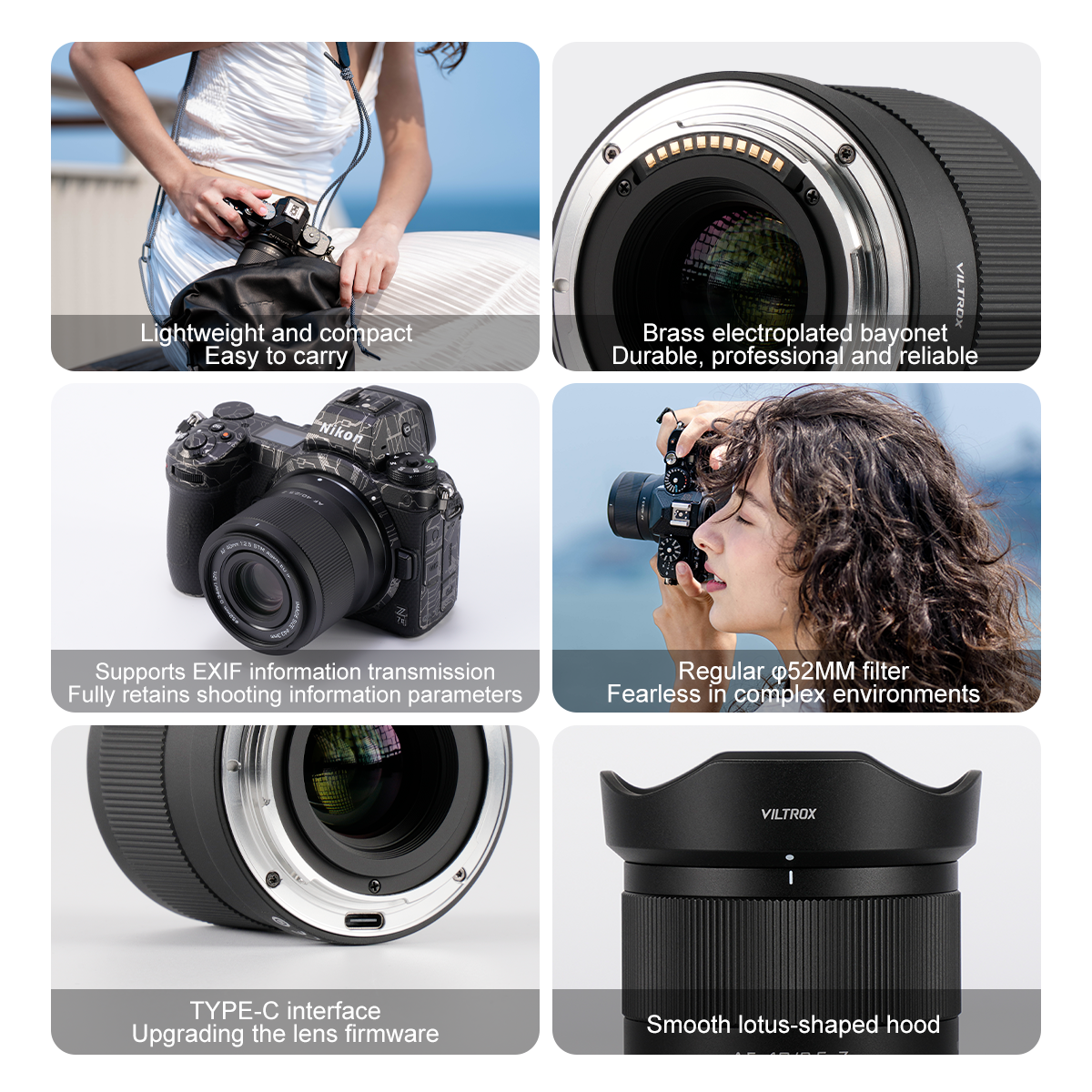 AF 40mm F2.5, Viltrox Air serija lahkih fotoaparatov polnega formata predstavlja 40 mm goriščno razdaljo, učinkovit in natančen sistem samodejnega ostrenja za zajemanje čudovitih trenutkov, tako da lahko vsakdo uživa v fotografiji. Pokriva slikovno polje polnega formata in se ujema z več modeli. Kompaktno in lahko ohišje objektiva, enostavno za prenašanje. Vsestranska goriščna razdalja 40 mm je idealna za vsakodnevno fotografiranje in potovanja.