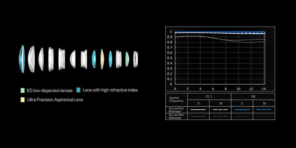 1 ED element učinkovito popravi aksialno kromatsko aberacijo in zagotavlja ostre slike brez barvnih robov.