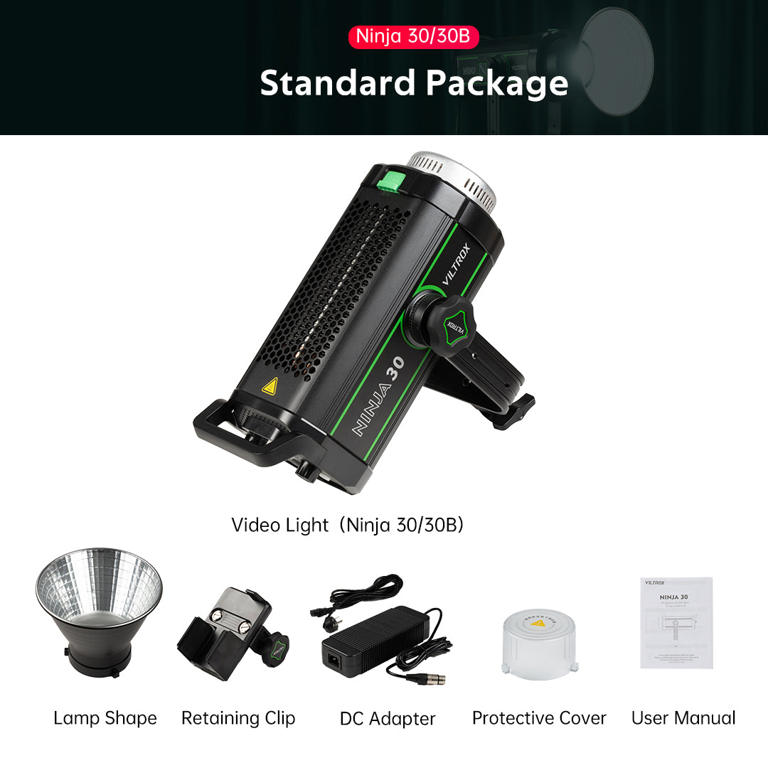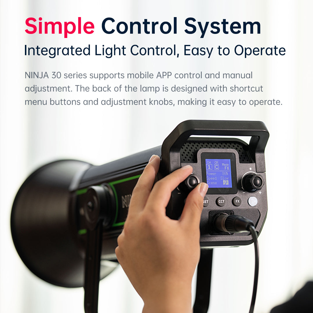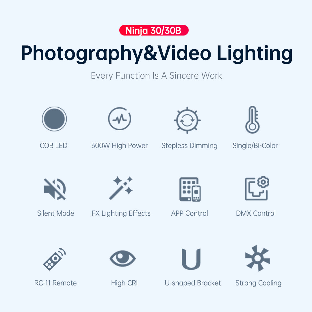 Serija NINJA 30 zagotavlja visoko svetilnost 300 W. S standardnim 55-stopinjskim senčilom lahko osvetlitev na razdalji 1 metra preseže 100 000 LUX, kar lahko učinkovito pokrije potrebe po snemanju velikih prizorov.