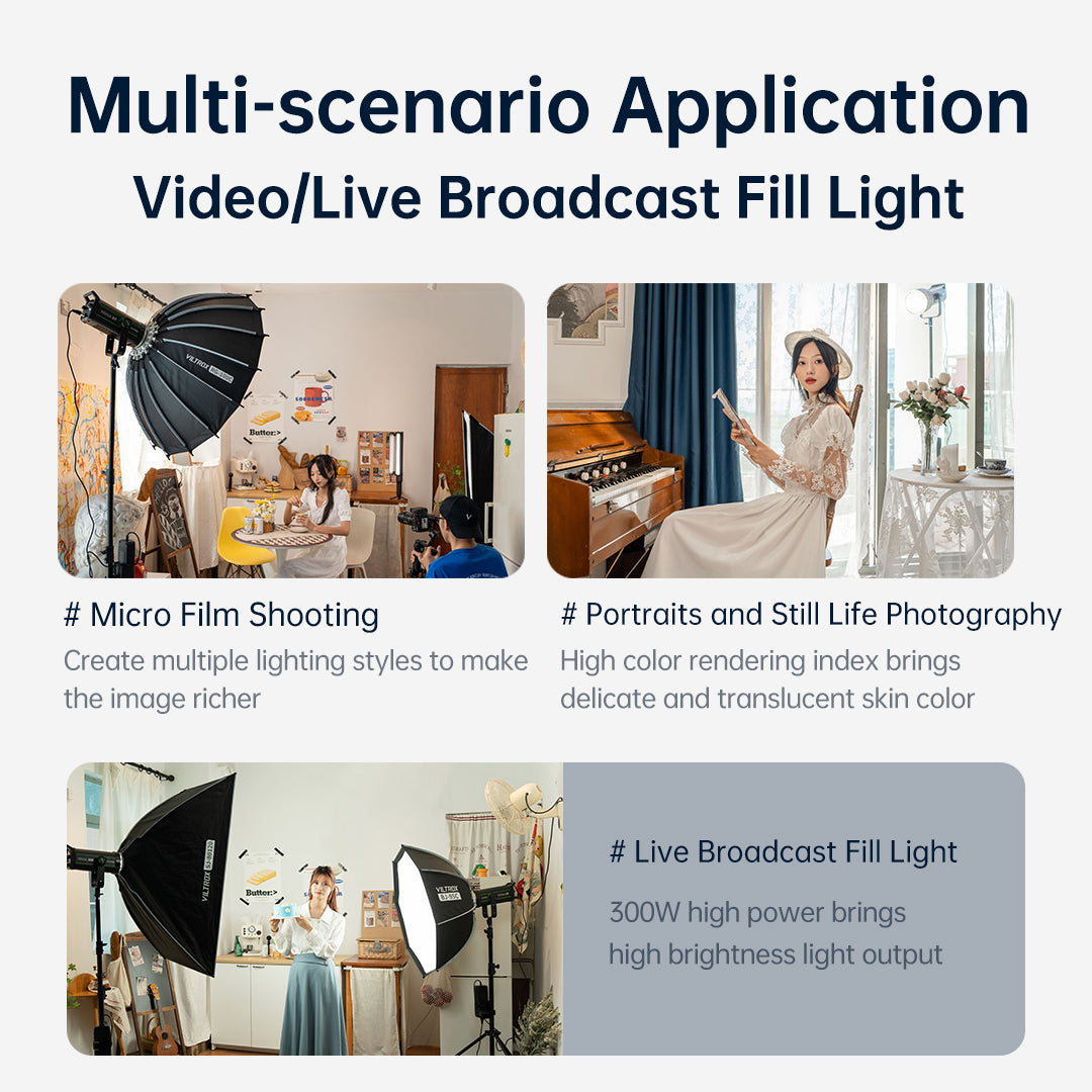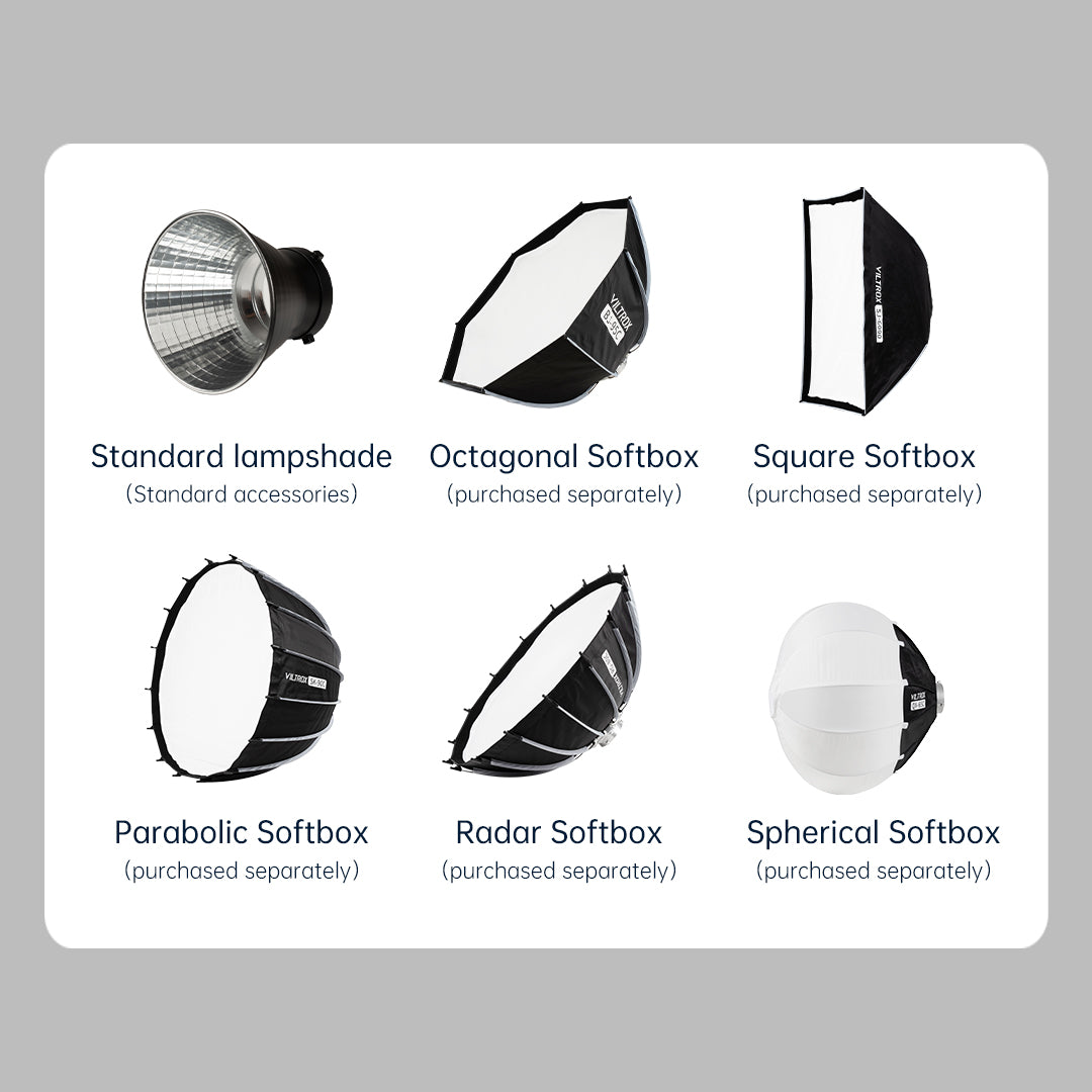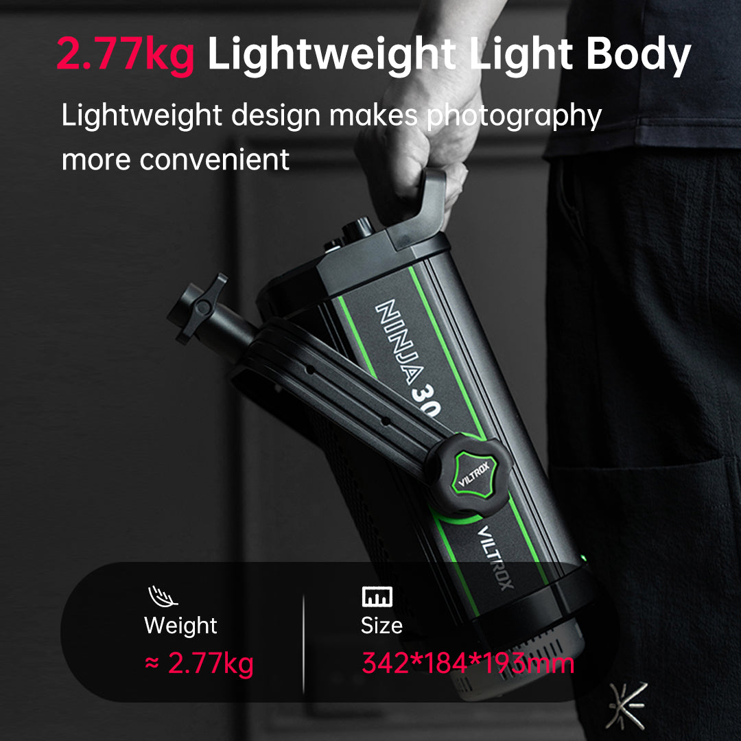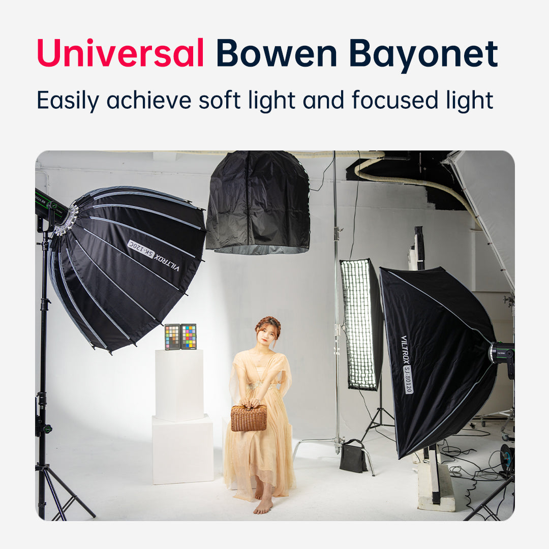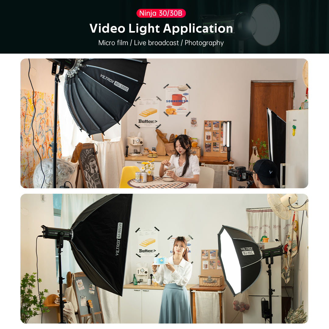 Serija NINJA 30 je opremljena z Bowenovim nastavkom, ki je razširjen v industriji, in je združljiva s fotografsko opremo VILTROX: osmerokotnim softboxom, globokim paraboličnim softboxom, sferičnim difuzorjem itd. za izpolnjevanje potreb po osvetlitvi v različnih priložnostih.