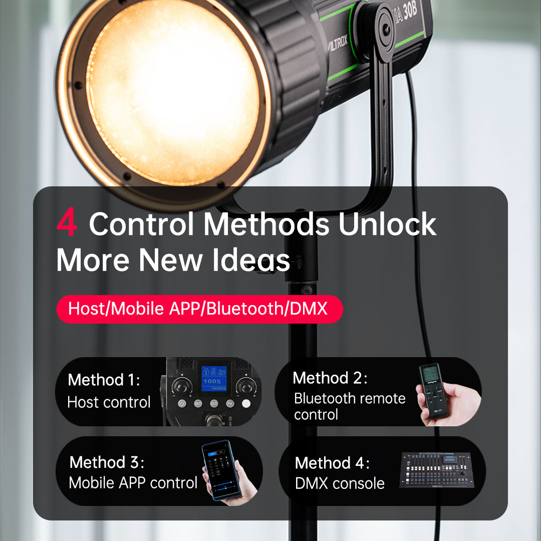Luči serije NINJA 30 uporabljajo tehnologijo prilagajanja z brezžičnim daljinskim upravljalnikom, z 19 kanali v 6 skupinah, ki se upravljajo ločeno. Svetlost, barvno temperaturo, svetlobni učinek itd. lahko prilagodite z različnimi načini zatemnjevanja.