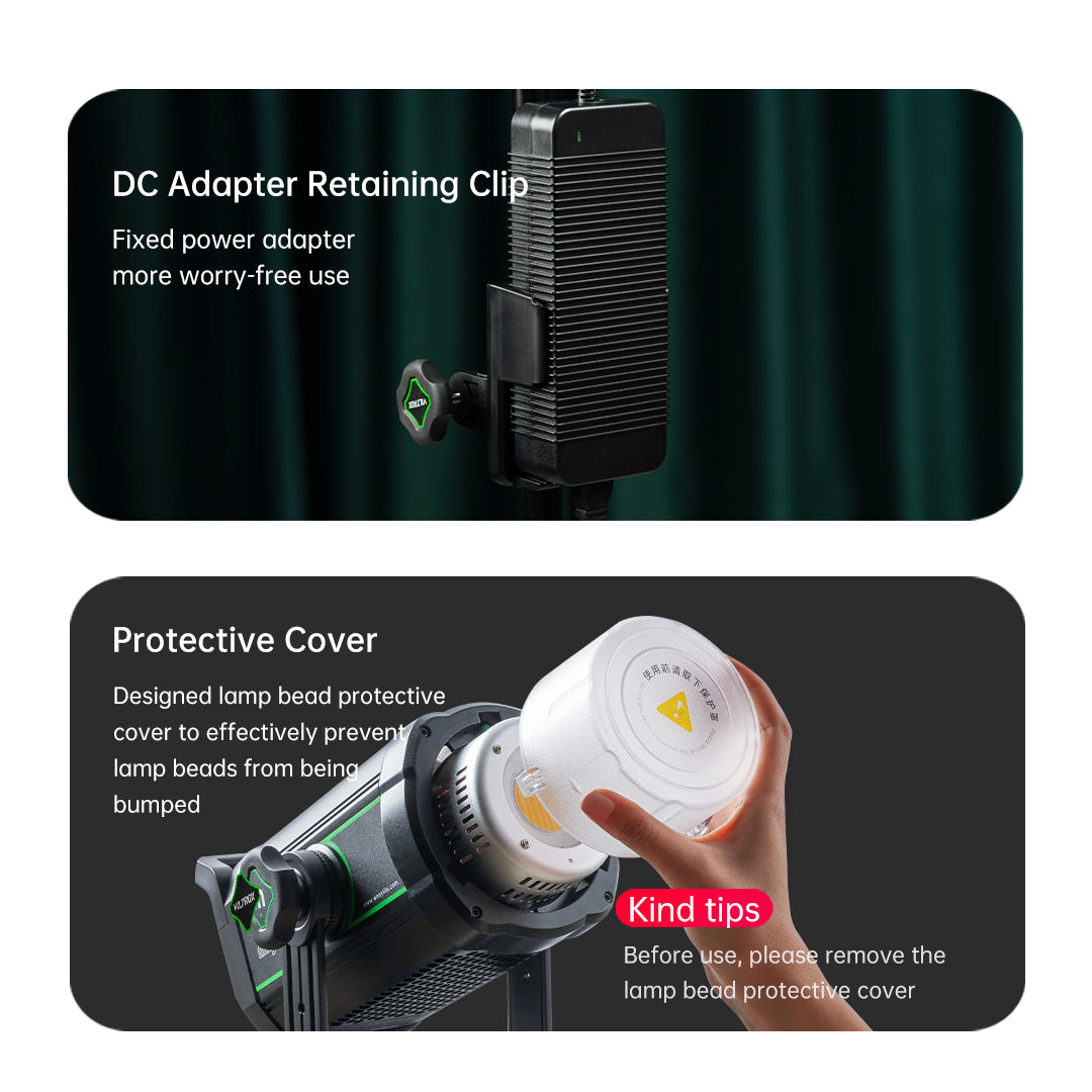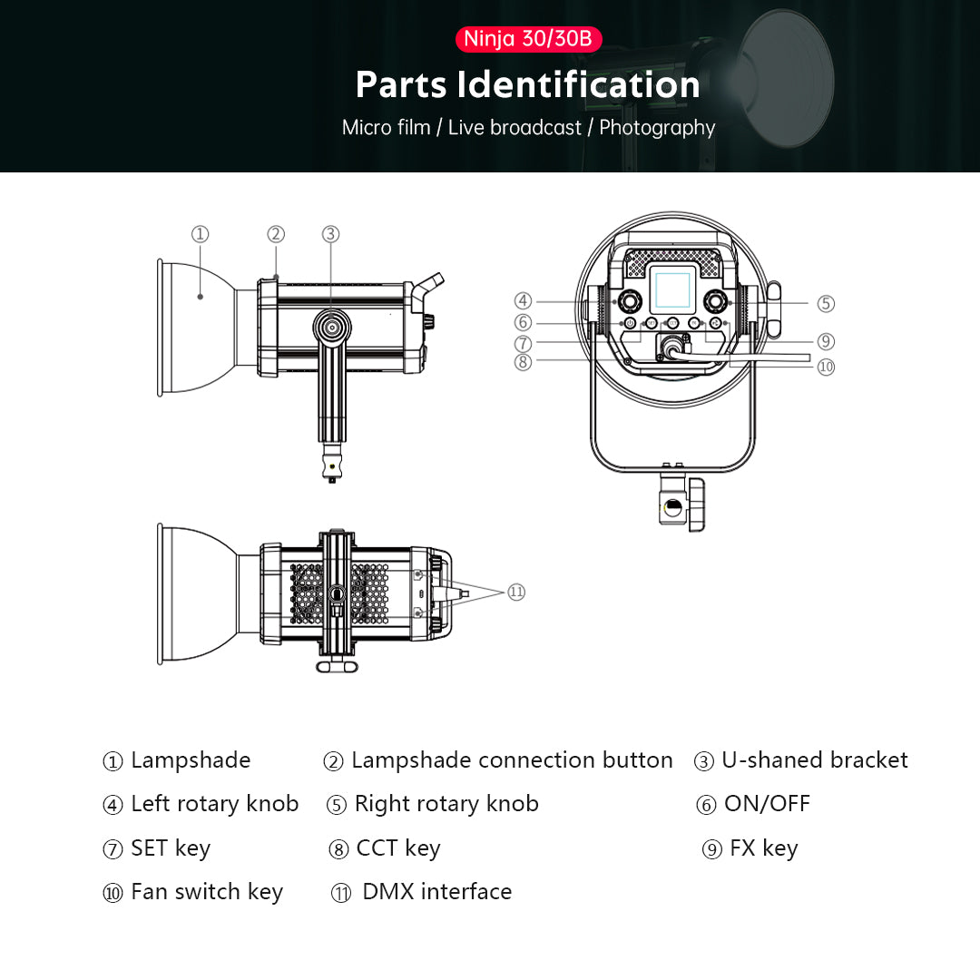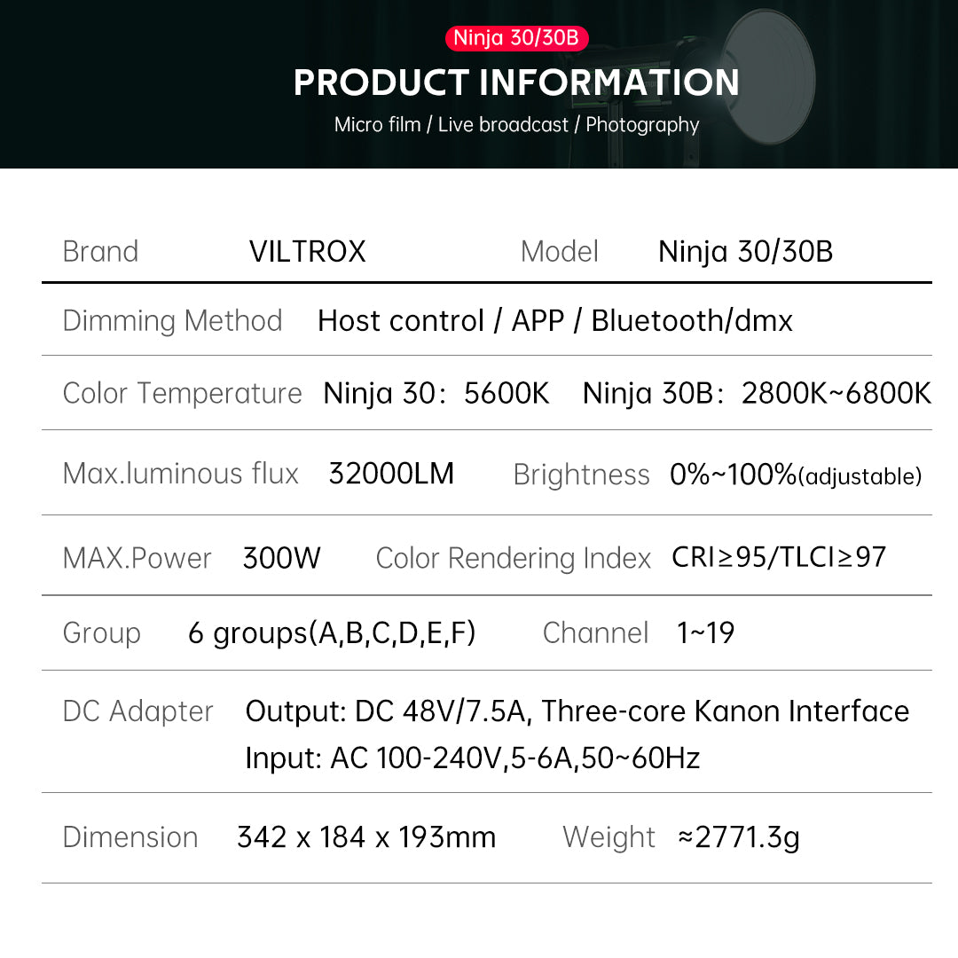 Serija NINJA 30 je 300W visokozmogljiv točkovni svetlobni vir LED video luči z visoko osvetljenostjo, podpira različne profesionalne metode nadzora, standardni Bowen bajonet in različne dodatke za nadzor svetlobe, visokokakovostno kovinsko ohišje iz letalskega aluminija. Zmogljivost serije NINJA 30 je bila v vseh pogledih neprimerljivo izboljšana, kar vam prinaša bolj profesionalno in učinkovito izkušnjo filmske in televizijske osvetlitve!