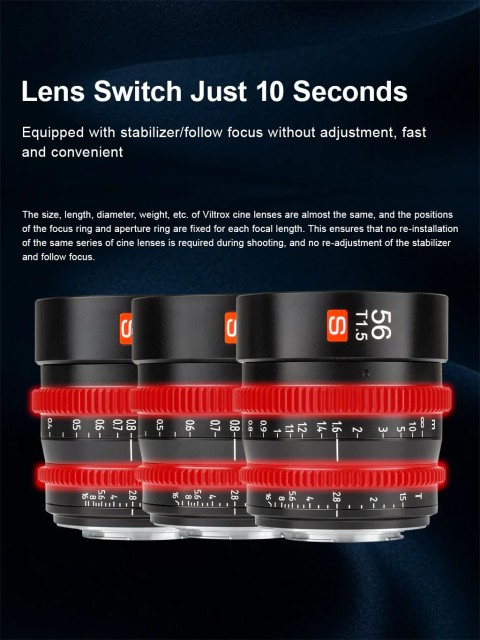 Viltroxovi filmski objektivi MFT ponujajo dosledno velikost/težo/težo/težo/kontrolo za enostavno zamenjavo v okviru opreme fotoaparata. Ponašajo se tudi z zelo dobro zaslonko T/1,5, zobatimi obročki za zaslonko/ostritev, odlično ostrino, minimalnim dihanjem, nizkim popačenjem in kromatsko aberacijo, nanopremazom leč za zmanjševanje bleščanja, 14-delno zaslonko…