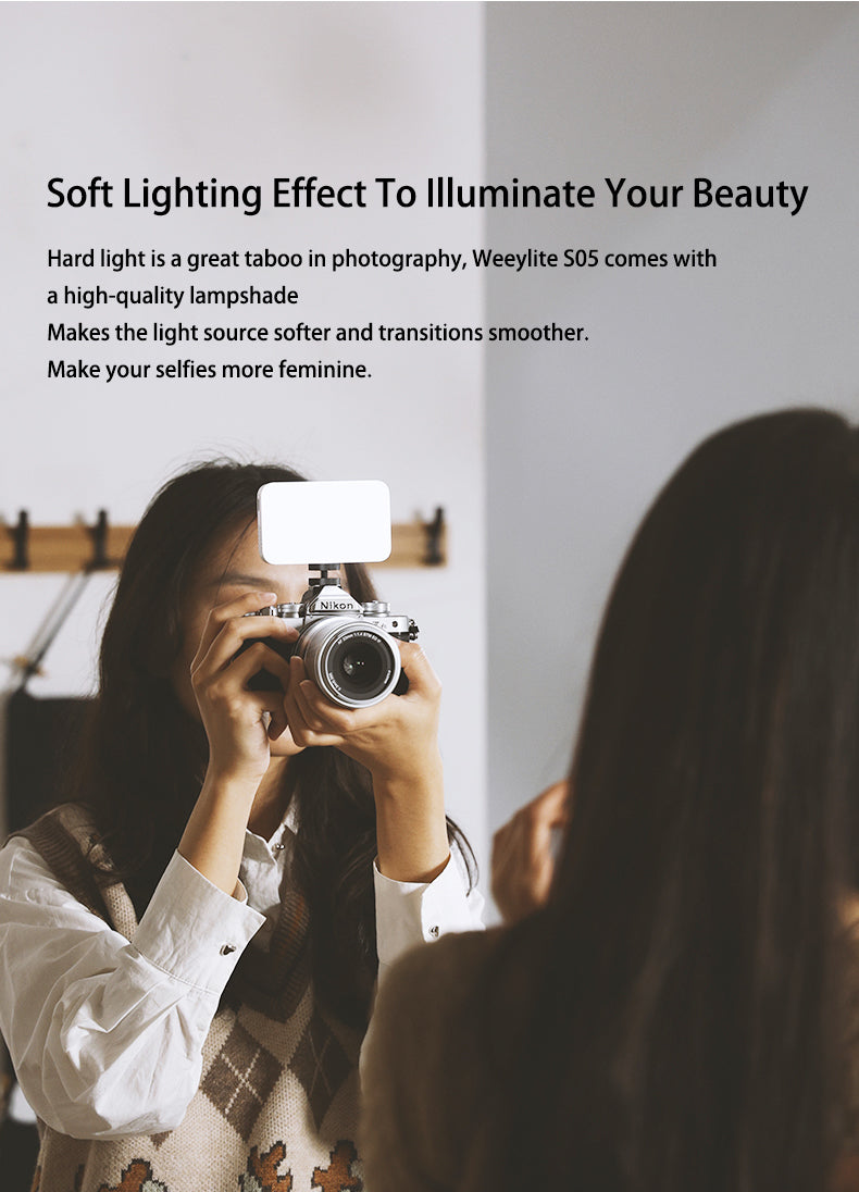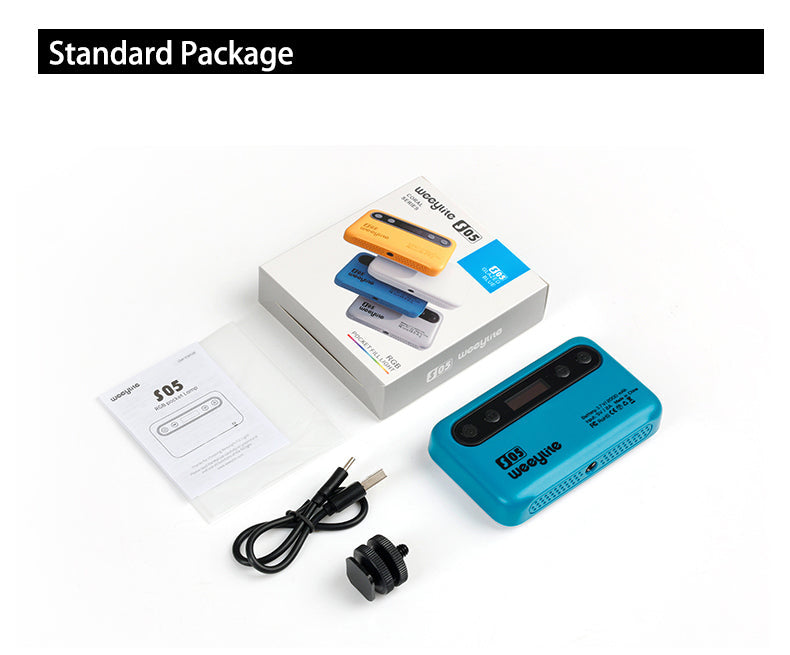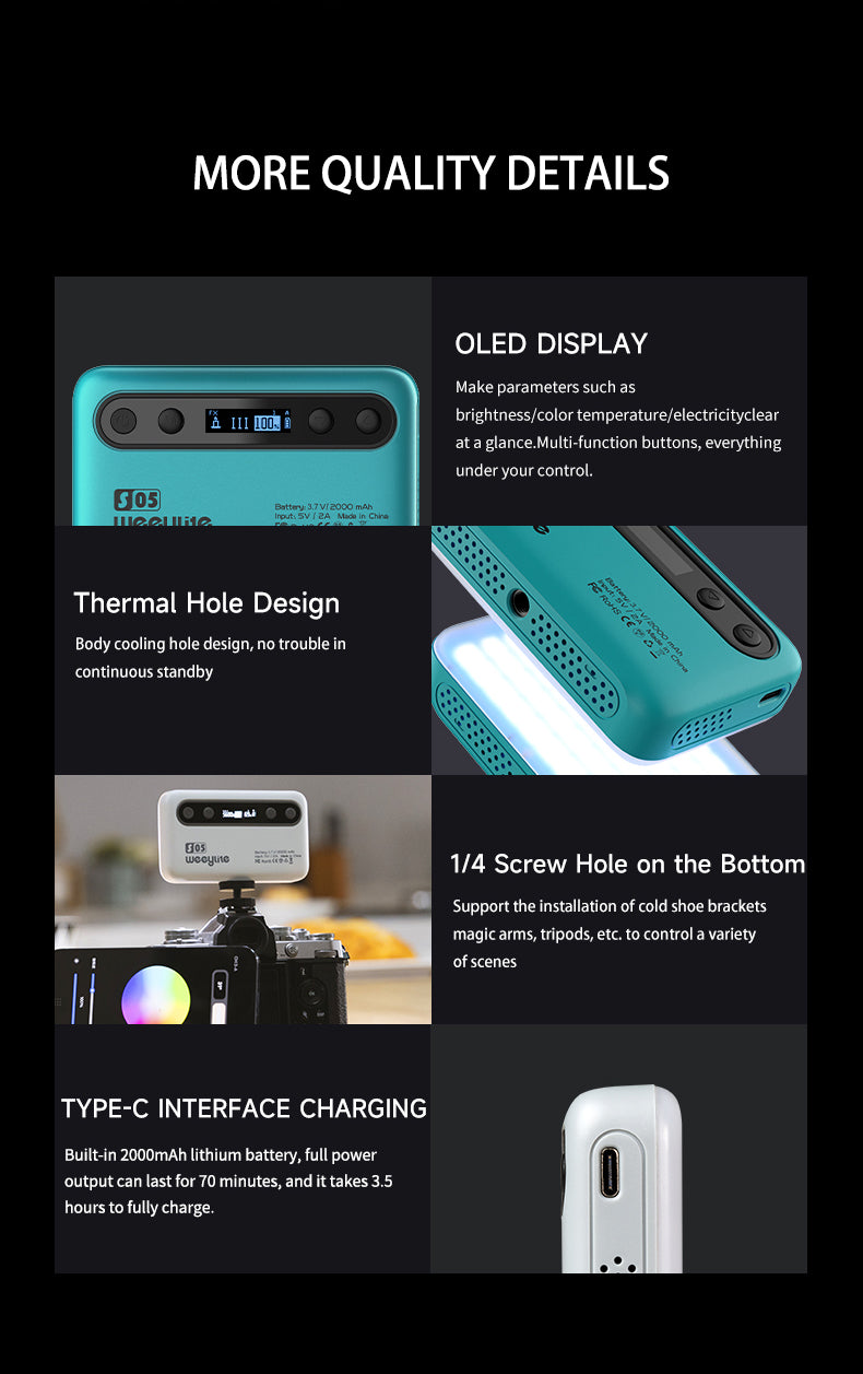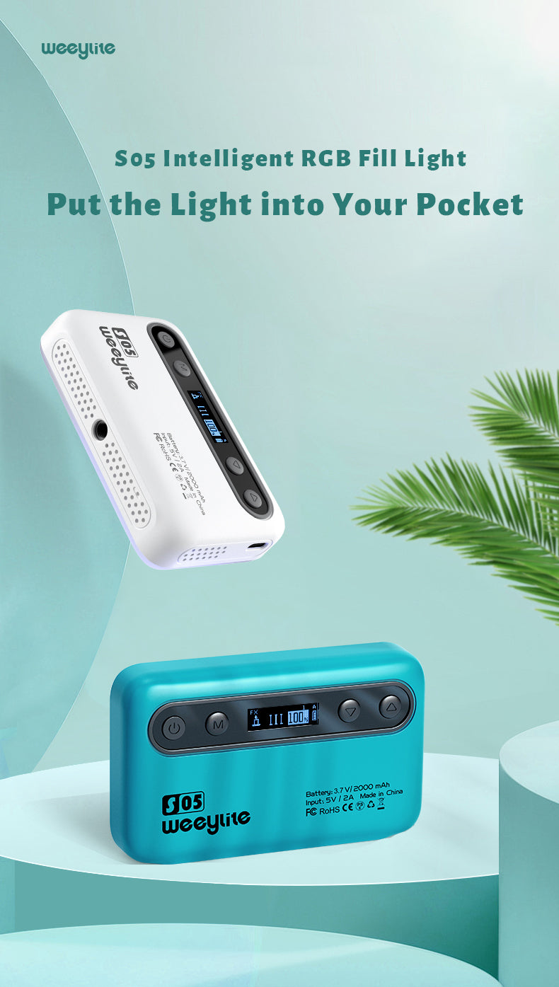 Weeylite S05 polnilna luč je prenosna ročna polnilna luč. Ima visoko zmogljivo barvo (pozitivna bela + topla bela) in visokokakovostno svetlobo RGB LED. Ima nizko porabo energije, stabilno barvno temperaturo, varčevanje z energijo in močjo, dolgo življenjsko dobo, kompaktno velikost in jo je mogoče enostavno prenašati. Luč se lahko uporablja v različnih prizorih in je kot nalašč za fotografiranje, snemanje videoposnetkov, vloganje, oddajanje v živo itd.