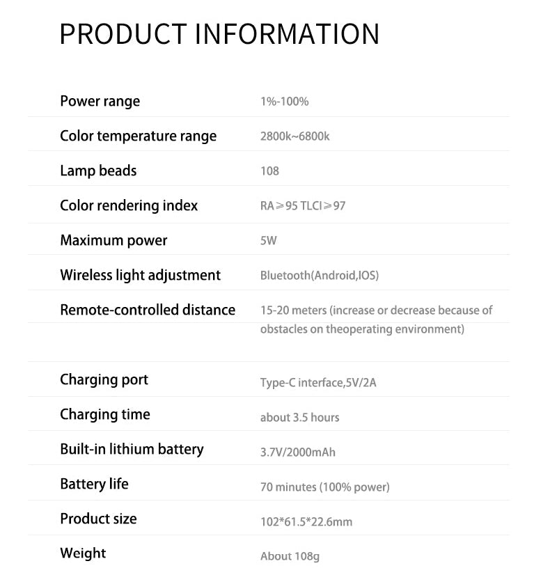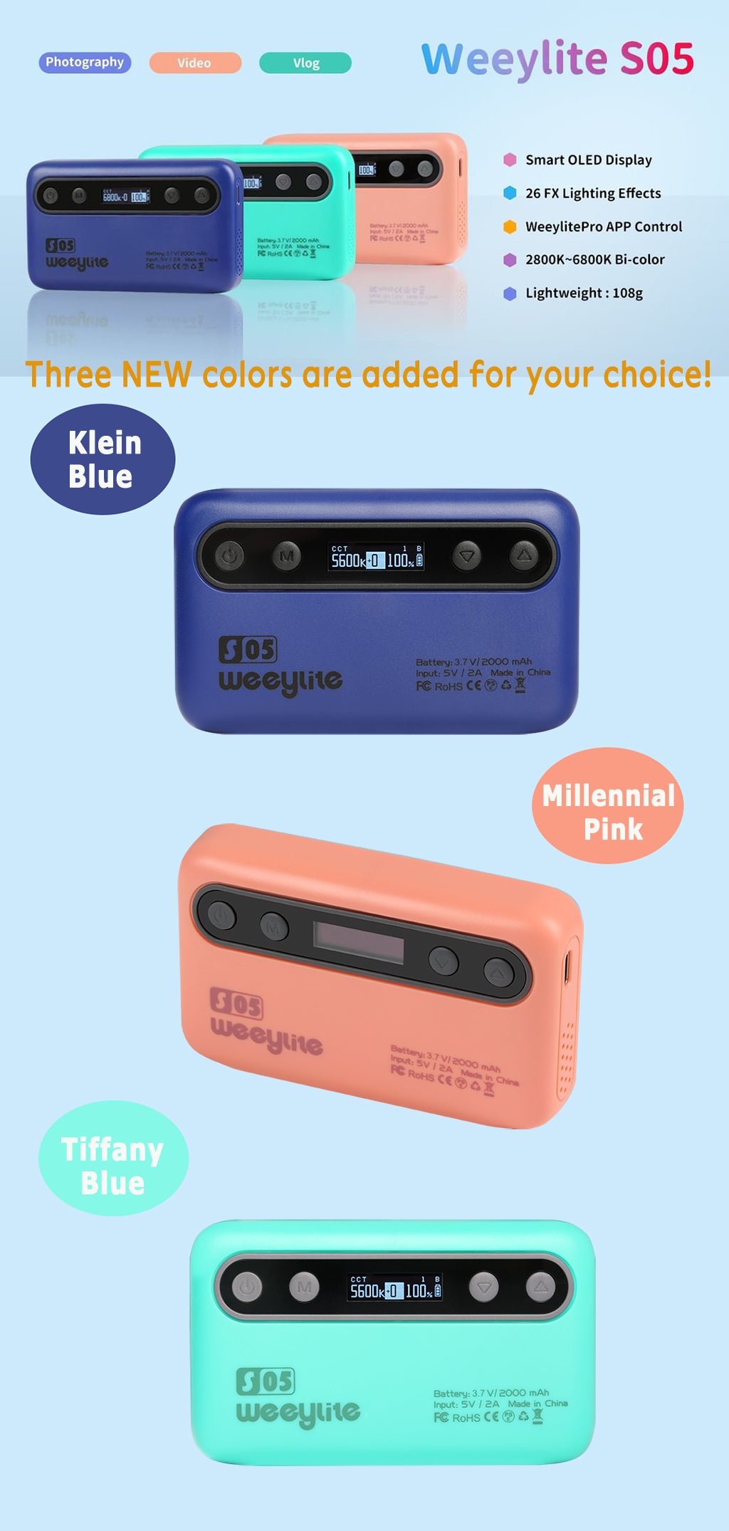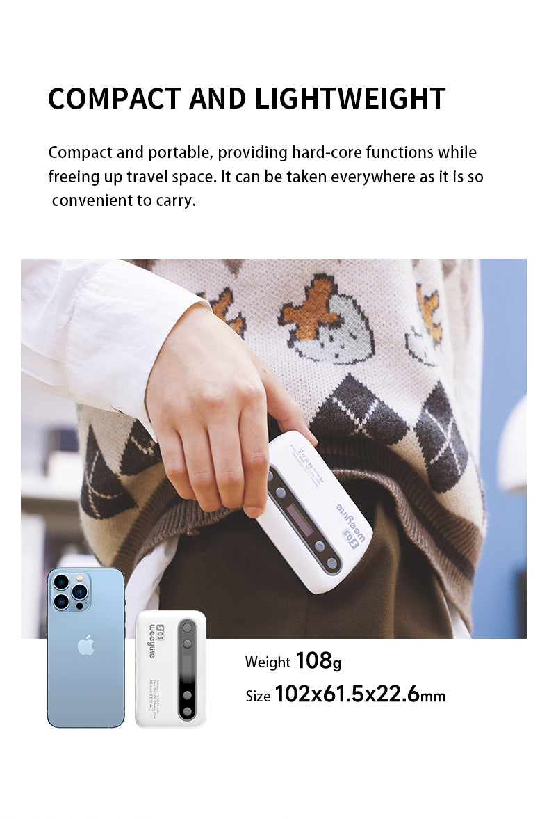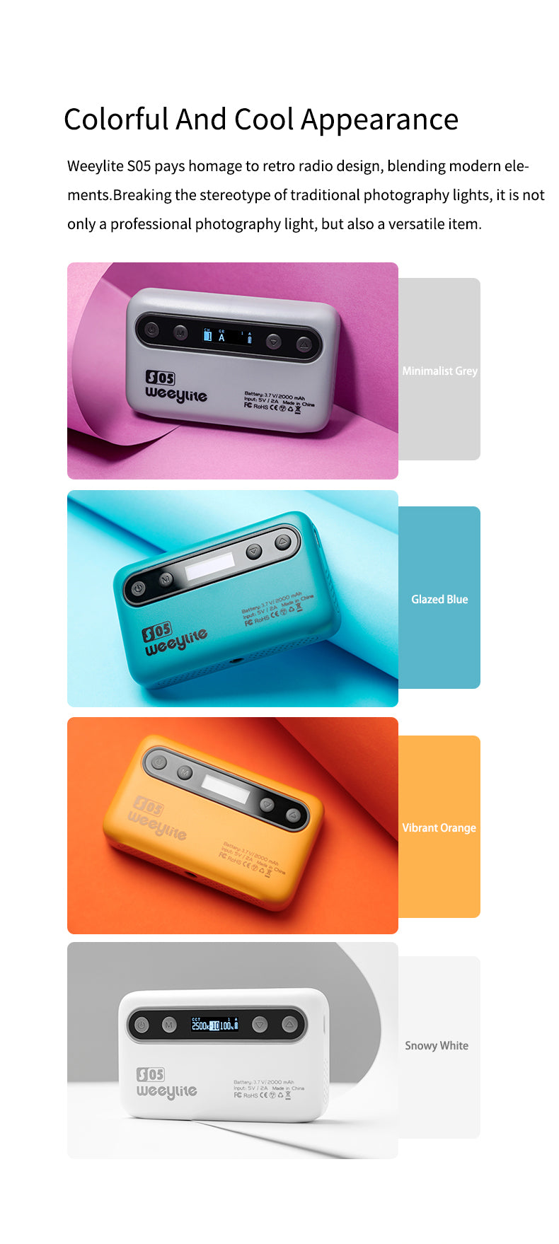 Weeylite S05 polnilna luč je prenosna ročna polnilna luč. Ima visoko zmogljivo barvo (pozitivna bela + topla bela) in visokokakovostno svetlobo RGB LED. Ima nizko porabo energije, stabilno barvno temperaturo, varčevanje z energijo in močjo, dolgo življenjsko dobo, kompaktno velikost in jo je mogoče enostavno prenašati. Luč se lahko uporablja v različnih prizorih in je kot nalašč za fotografiranje, snemanje videoposnetkov, vloganje, oddajanje v živo itd.