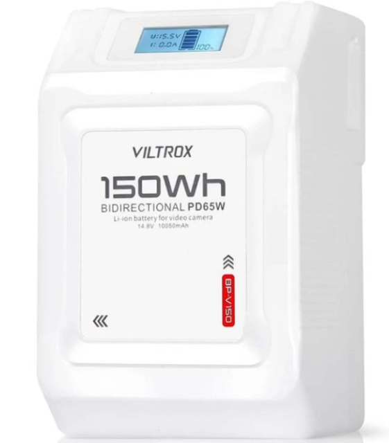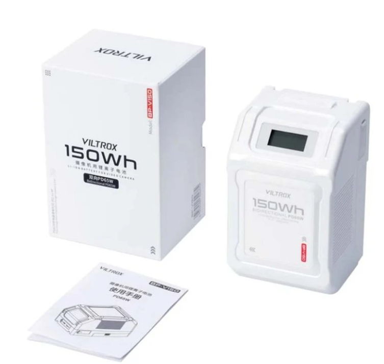 Baterija Viltrox BP-V150 V-Mount je litij-ionska baterija z visoko zmogljivostjo 150 Wh (10050 mAh), zasnovana za profesionalno snemanje filmov in fotografijo, z več izhodnimi vrati, hitrim PD polnjenjem, LCD-zaslonom za prikaz stanja in robustno varnostno zaščito.