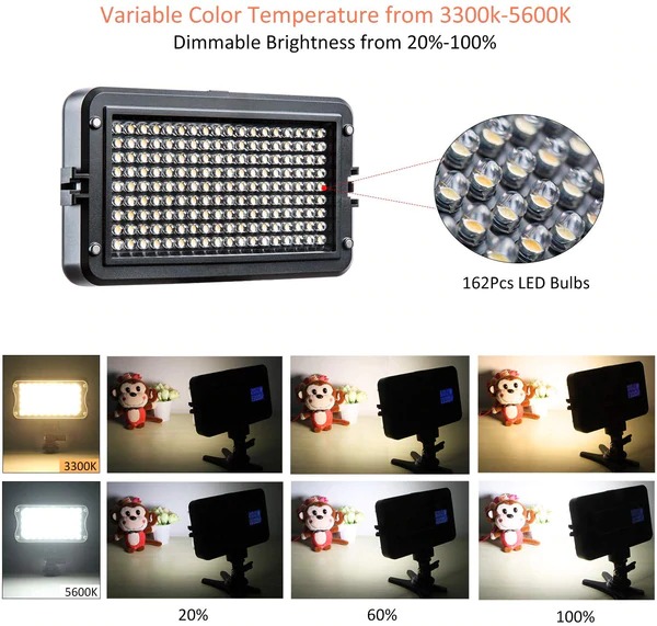 Funkcija zatemnitve in barvni načini:Z zatemnitvijo svetlosti (20-100 %) in spremenljivo barvno temperaturo (3300K-5600K) lahko polepšate videoposnetke ali slike.4 priložene filtre je mogoče preprosto namestiti z magnetom za ustvarjalne učinke različnih barv svetlobe.