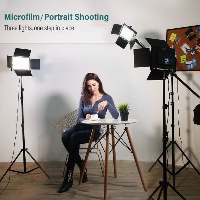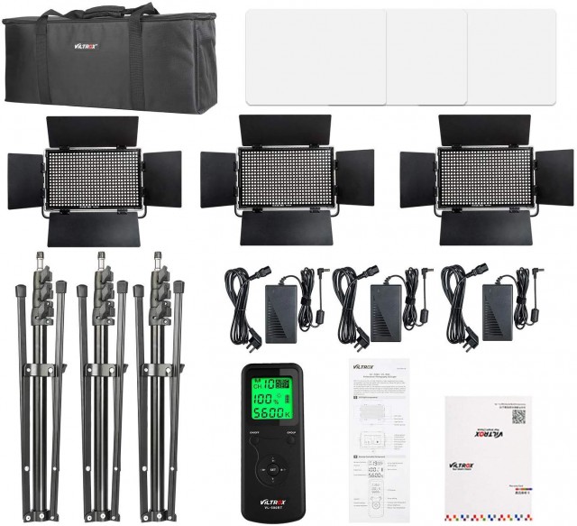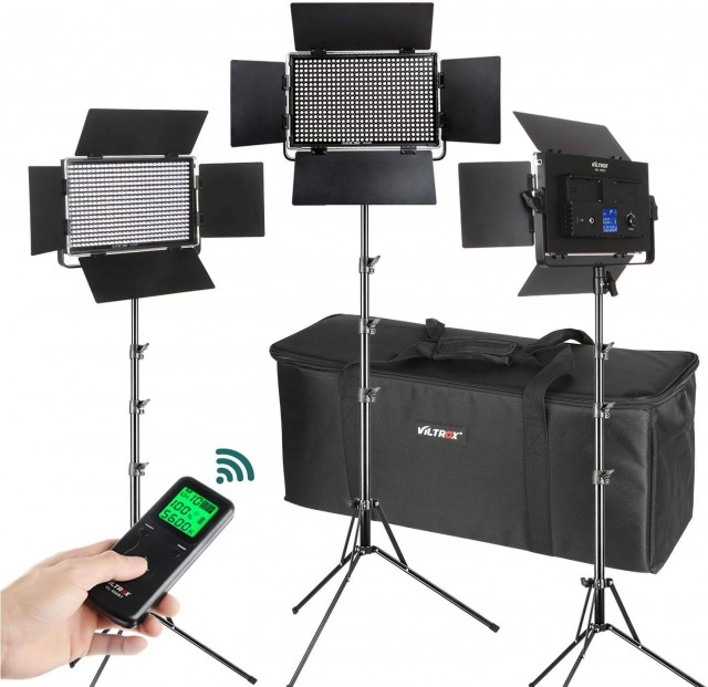 Komplet treh luči Viltrox VL-40T. Intenzivna 40W dvobarvna LED luč z nastavljivo barvno temperaturo (v območju 3300-5600K) in jakostjo (20-100 %; največ 4400 lm, 2600 lx/1 m). Ponuja možnost brezžičnega daljinskega upravljanja (2,4 GHz, daljinski upravljalnik je priložen) in možnost napajanja z baterijami (NP-F960 / F970, baterije niso priložene) ali zunanjim napajalnikom (priložen). Nastavitve parametrov omogoča pregleden zaslon LCD. Dimenzije 317x249x48 mm, teža 1200 g.
