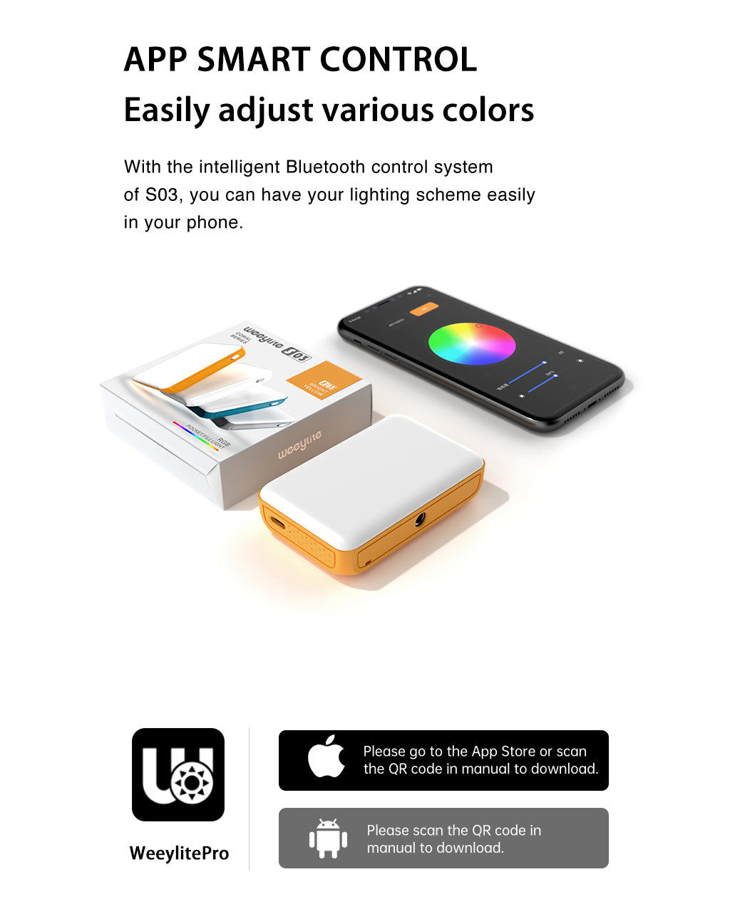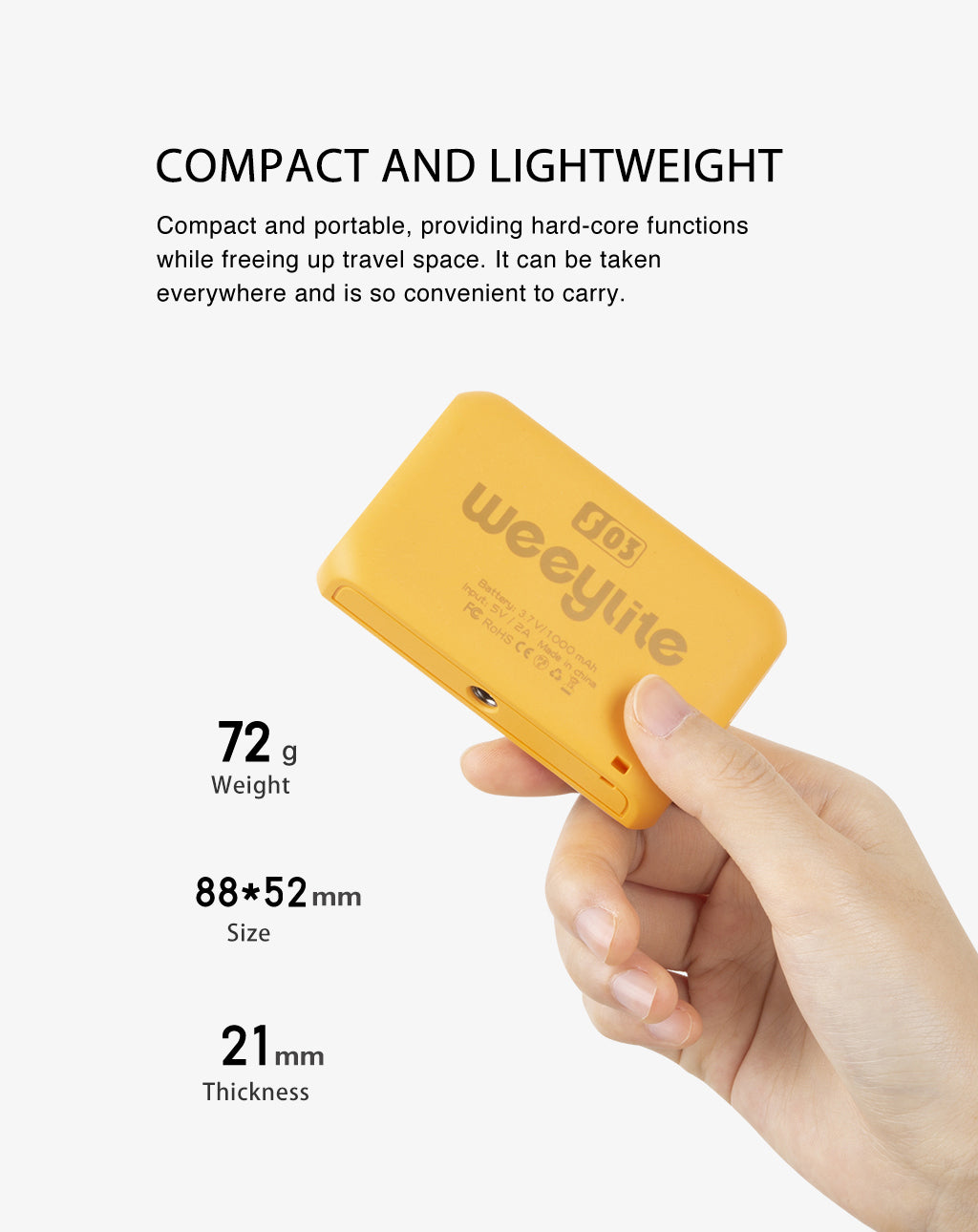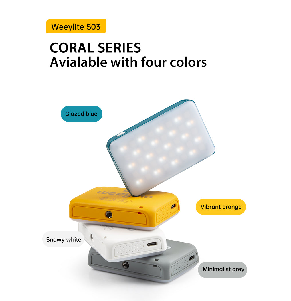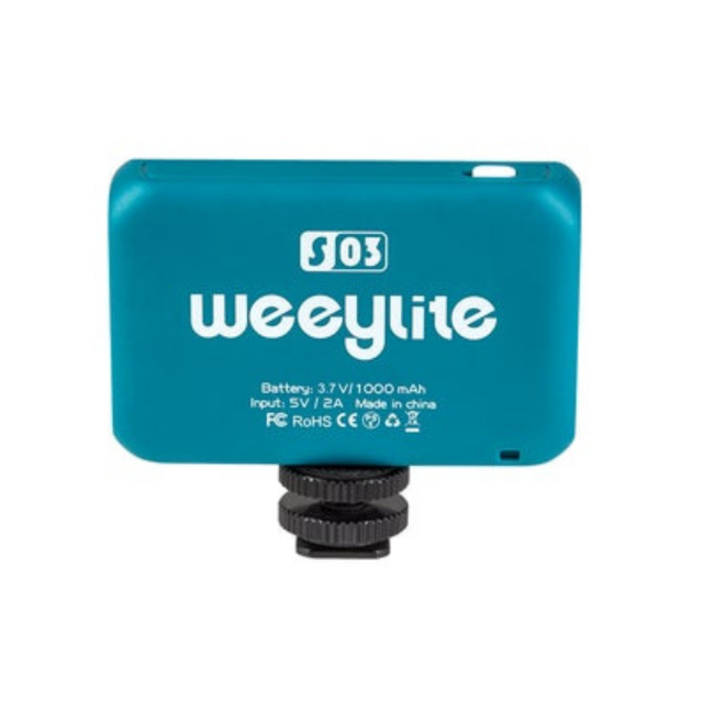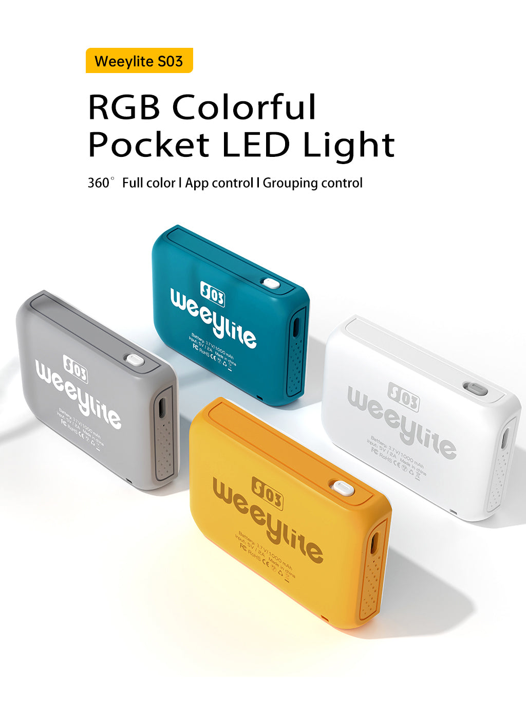 Žepna LED luč Weeylite S03 z močjo 4 W združuje 60 belih/toplo belih/RGB LED diod v edinstvenem kompaktnem ohišju (debelina le 21 mm, teža približno 70 g) z daljinskim upravljalnikom (Bluetooth, iOS/Andoid) s svetilnostjo v razponu 1-100 % in barvno temperaturo v razponu 2800-6800 K. Luč je opremljena z notranjo baterijo z življenjsko dobo približno 1 h pri največji jakosti in polnjenjem prek vmesnika USB-C (približno 3 h). Zanimiv dodatek kompaktnim fotografskim napravam, za vloganje, snemanje predstavitev itd.