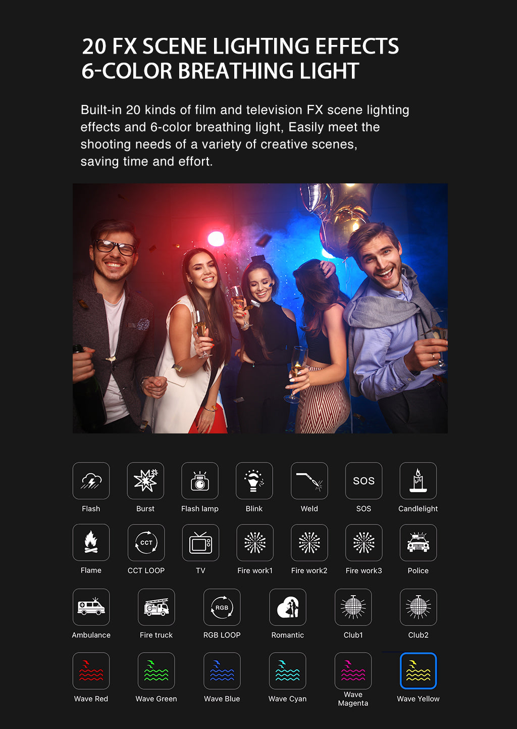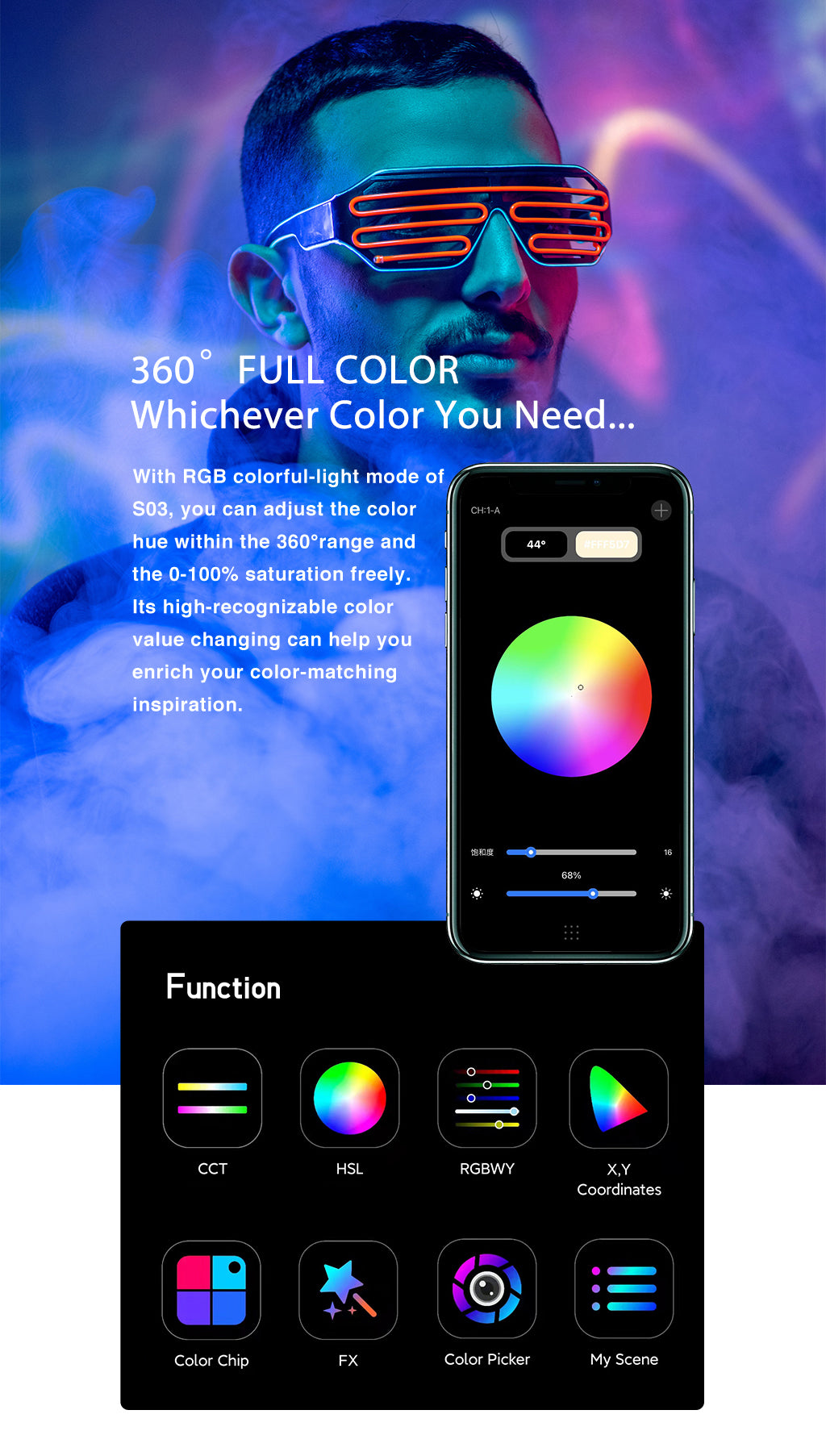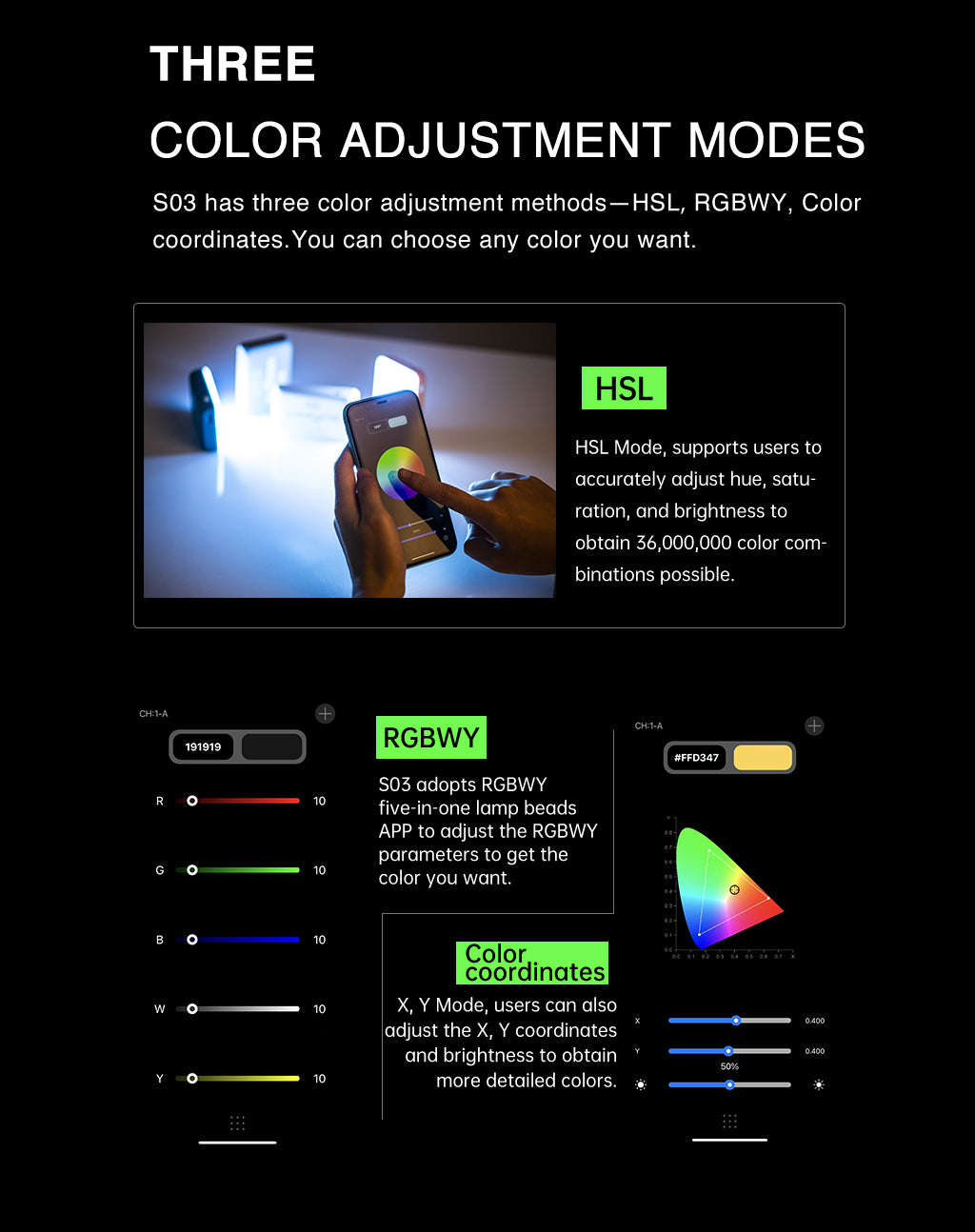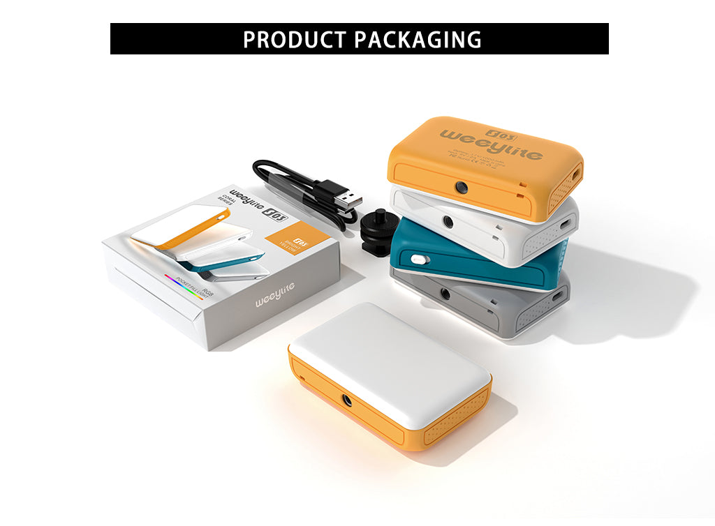 Žepna LED luč Weeylite S03 z močjo 4 W združuje 60 belih/toplo belih/RGB LED diod v edinstvenem kompaktnem ohišju (debelina le 21 mm, teža približno 70 g) z daljinskim upravljalnikom (Bluetooth, iOS/Andoid) s svetilnostjo v razponu 1-100 % in barvno temperaturo v razponu 2800-6800 K. Luč je opremljena z notranjo baterijo z življenjsko dobo približno 1 h pri največji jakosti in polnjenjem prek vmesnika USB-C (približno 3 h). Zanimiv dodatek kompaktnim fotografskim napravam, za vloganje, snemanje predstavitev itd.