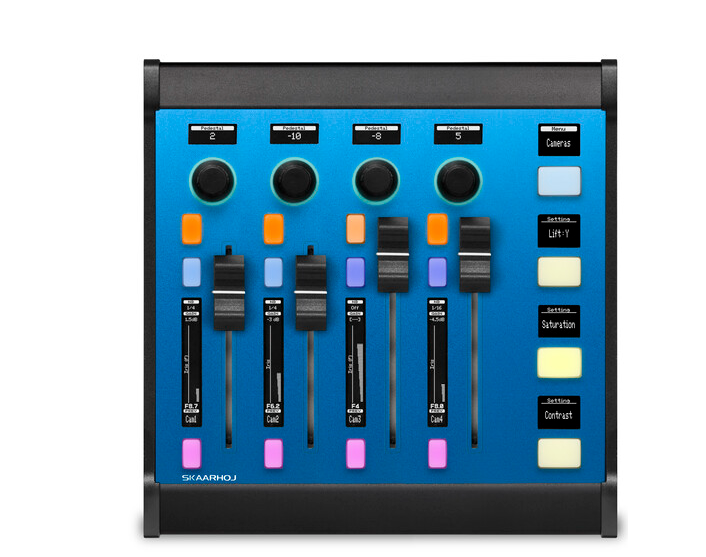 SKAARHOJ Wave Board Mini z vgrajenim Blue Pill (modra barva) je kompakten profesionalni avdio mešalni krmilnik z motoriziranimi drsniki, OLED-zasloni in kodirnimi gumbi, zasnovan za natančno upravljanje zvoka v okviru produkcije v živo in pretočnih delovnih tokov.