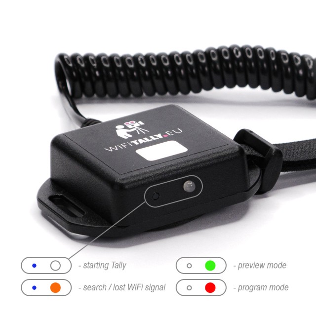 Mikro lučka WiFi Tally light vsebuje dve luči LED. Ta ima modro barvo, ki označuje stanje povezave ali izgubo signala. Druga dioda LED obvešča operaterja kamere (snemalca) o stanju njegovega režijskega posnetka. Če je glavna dioda LED zelene barve, se posnetek pripravlja za predvajanje, če pa je rdeče barve, je njegov posnetek tik pred predvajanjem. To je barvno usklajeno z običajno zasnovo vseh režijskih videoposnetkov s predogledom/zeleno in programom/rdeče.