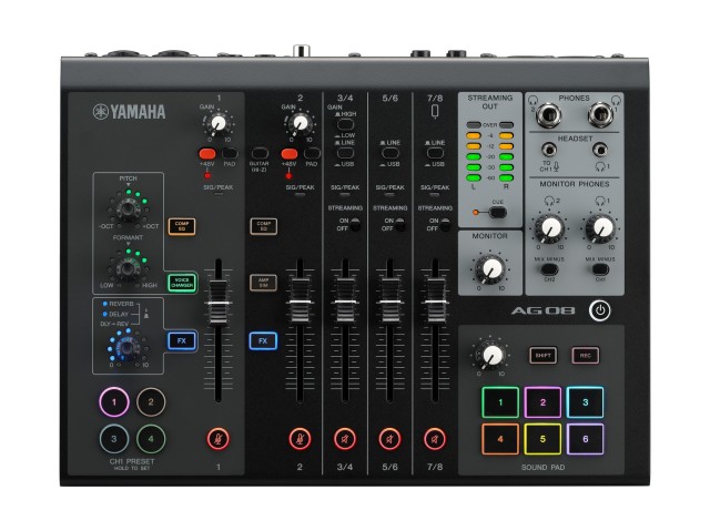 AG08 je 8-kanalna mešalna konzola za pretakanje v živo z dvema vhodoma s fantomskim napajanjem za kondenzatorske mikrofone, vgrajenim zvočnim vmesnikom USB, menjalnikom glasov in vzorčevalnikom. Z integracijo bolj prilagodljivih možnosti usmerjanja vhodov/izhodov in USB, razširjenih funkcij nožnih stikal ter dodatnih učinkov DSP in izboljšanega notranjega vezja za vrhunski zvok lahko AG08 podpira impresiven obseg aplikacij za pretakanje v živo in ustvarjanje zvočnih vsebin brez povezave. Od nastopov za enega uporabnika do večuporabniških aplikacij, celo v obsegu popolne varietejske predstave, funkcije AG08 v realnem času bodo vaše občinstvo pustile v želji po še več.