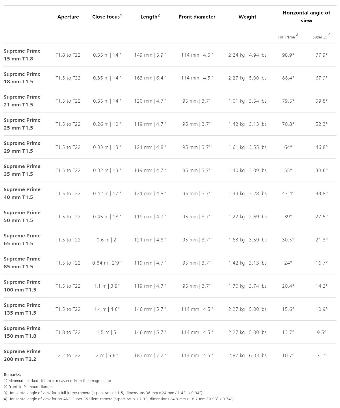 Linija vrhunskih filmskih objektivov ZEISS Supreme Prime ponuja največjo doslednost pri vseh modelih: enaka pokritost senzorja, barva, svetlost (T1.5 pri večini modelov), velikost, teža in namestitev upravljalnih elementov. Vsi objektivi iz serije zanesljivo pokrivajo senzorje FF (46,2 mm krožna projekcija), podpirajo tehnologijo eXtended Data in so - zahvaljujoč "sistemu zamenljivega bajoneta" - združljivi z bajoneti PL, LPL in EF (objektivi so standardno opremljeni z bajoneti PL in metričnimi oznakami).