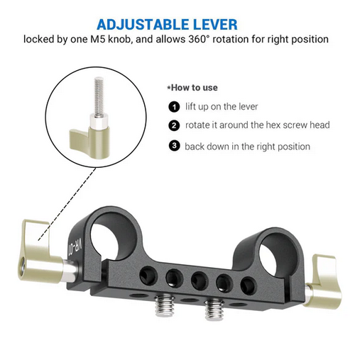 ZGCINE 15 mm Railblock je trpežna dvojna objemka za palice, zasnovana za 15-milimetrske podporne sisteme za tirnice. Ima več lukenj z navojem 1/4''-20 za pritrditev dodatne opreme in vzmetno ključavnico z zaskočnim mehanizmom za enostavno prilagajanje v tesnih prostorih.