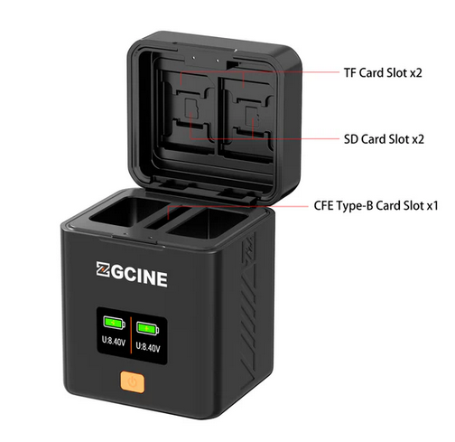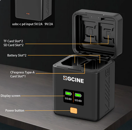 Polnilno ohišje ZGCINE za baterijo Fujifilm NP-W126S je kompaktno, večnamensko ohišje, ki podpira vhod/izhod USB-C PD, ima namenske reže za kartice SD, TF in CFE tipa B ter zaslon OLED za prikaz stanja.