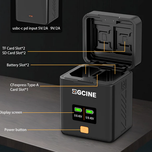 Polnilno ohišje ZGCINE za baterijo Panasonic LUMIX DMW-BLK22 je zasnovano za fotografe in snemalce, ki potrebujejo zanesljivo in prenosno rešitev za napajanje. To polnilno ohišje z dvojnim vhodom in izhodom USB-C PD zagotavlja hitro in učinkovito polnjenje baterije. Vključuje tudi reže za kartice SD, TF in CFE tipa B za priročno shranjevanje in organizacijo medijskih datotek. 0,96-palčni zaslon OLED prikazuje stanje polnjenja v realnem času, kar povečuje uporabnost.