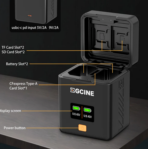 Polnilno ohišje ZGCINE za baterijo SONY NP-FZ100 je kompaktna in večnamenska polnilna rešitev z vhodom USB-C PD, dvema režama za baterijo, več režami za kartice in zaslonom OLED, zato je idealna za fotografe in snemalce na poti.